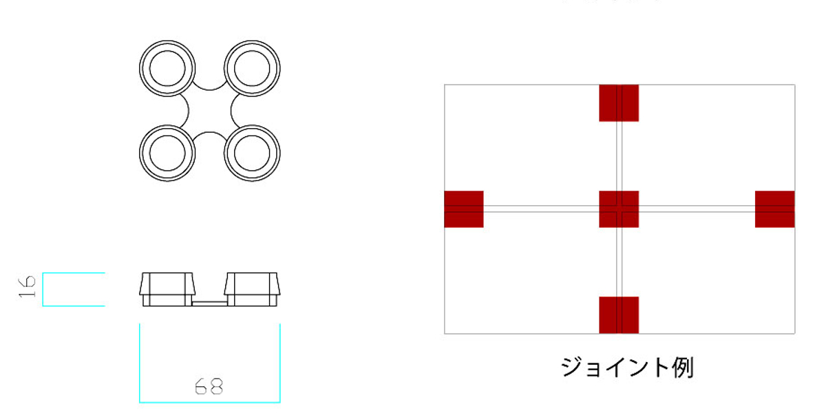 連結部品を使用することで、マット同士を連結でき、様々な設置場所に合わせて拡張が可能です。赤い部分がジョイントパーツの固定目安となります。
