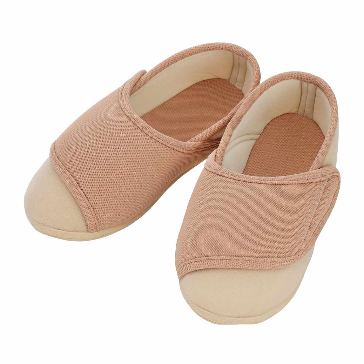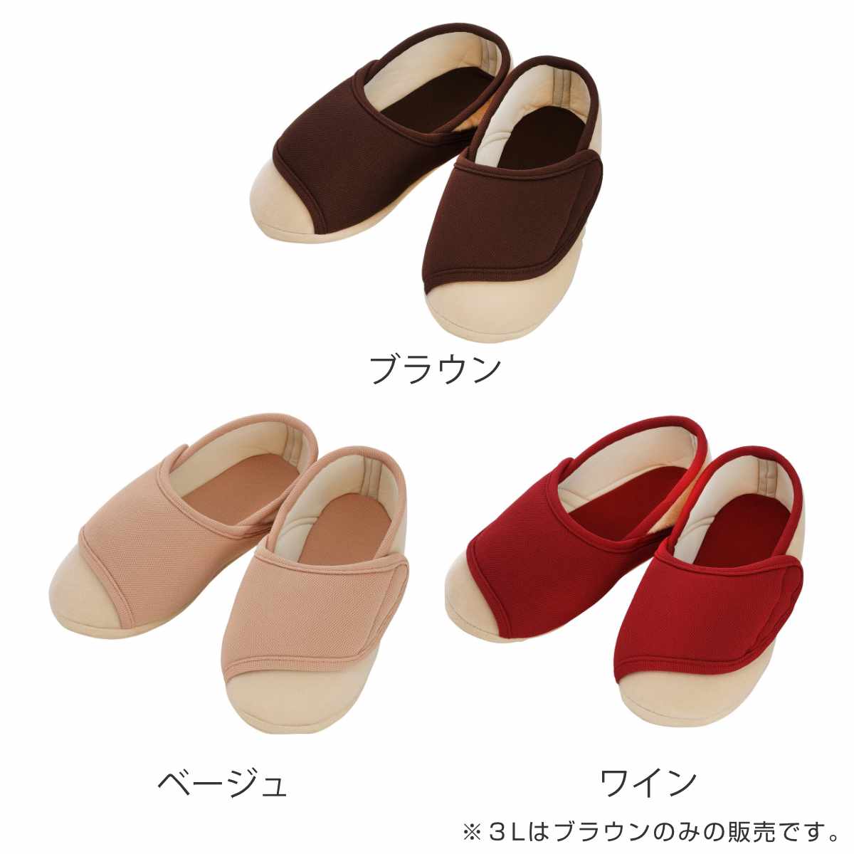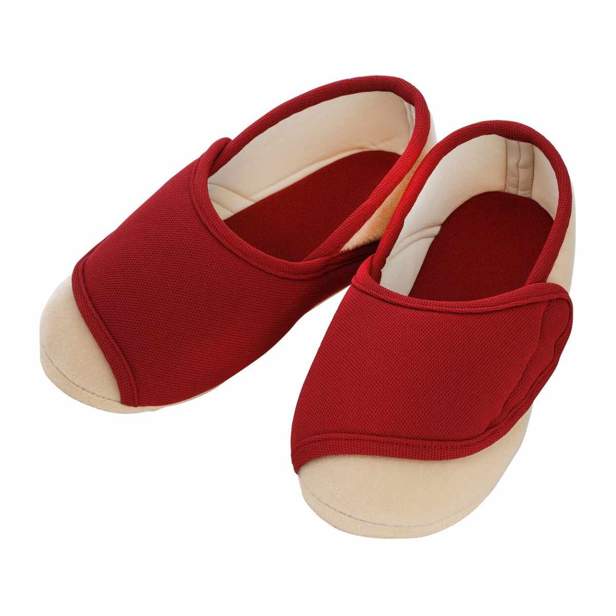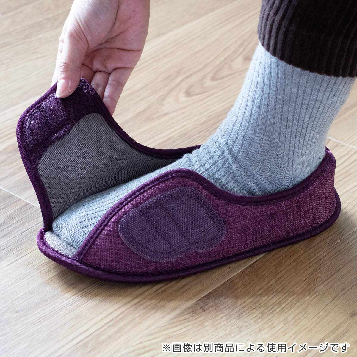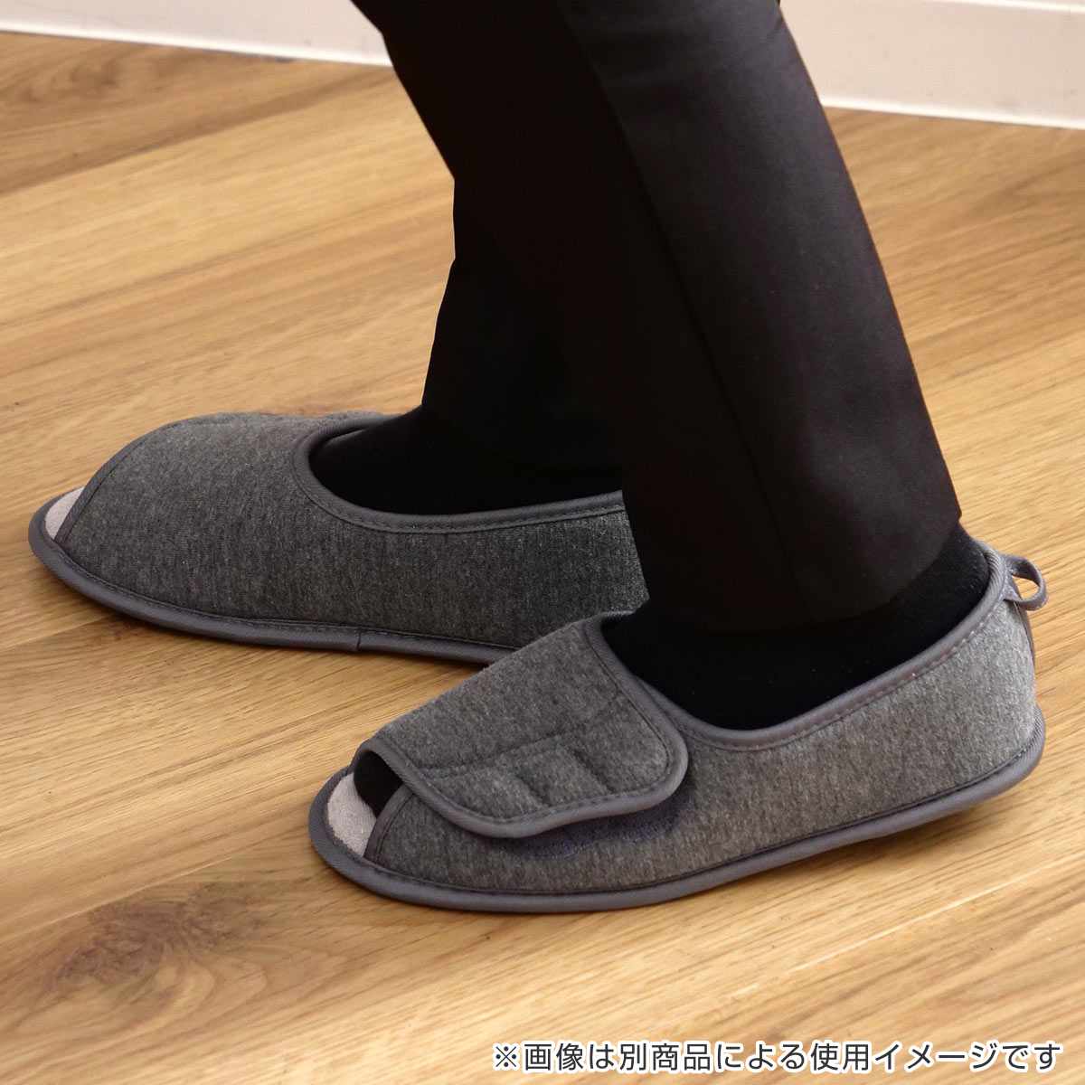 甲部分が全開して足入れスムーズ、介助者にとっても履かせやすいルームシューズです。面ファスナー式なので足の状態に合わせて調整できます。甲高の方にもおすすめです。