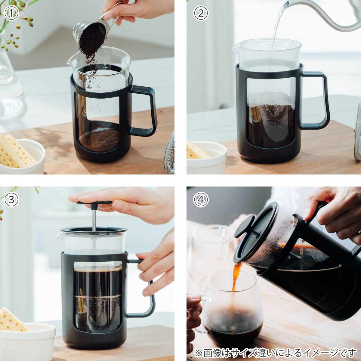 (コーヒーの場合はフィルターが下がりにくくなるので、2~3回に分けて押し下げてください。)