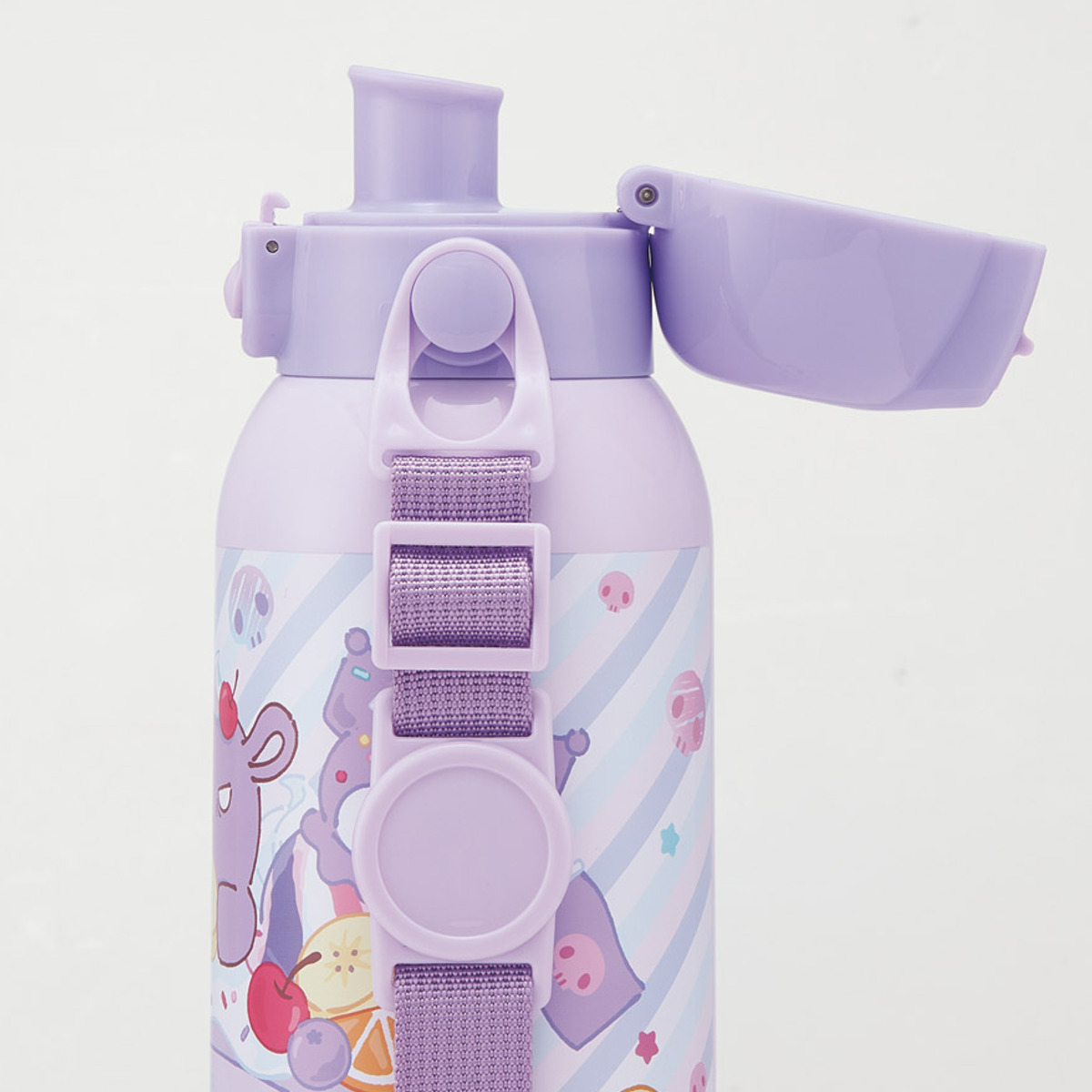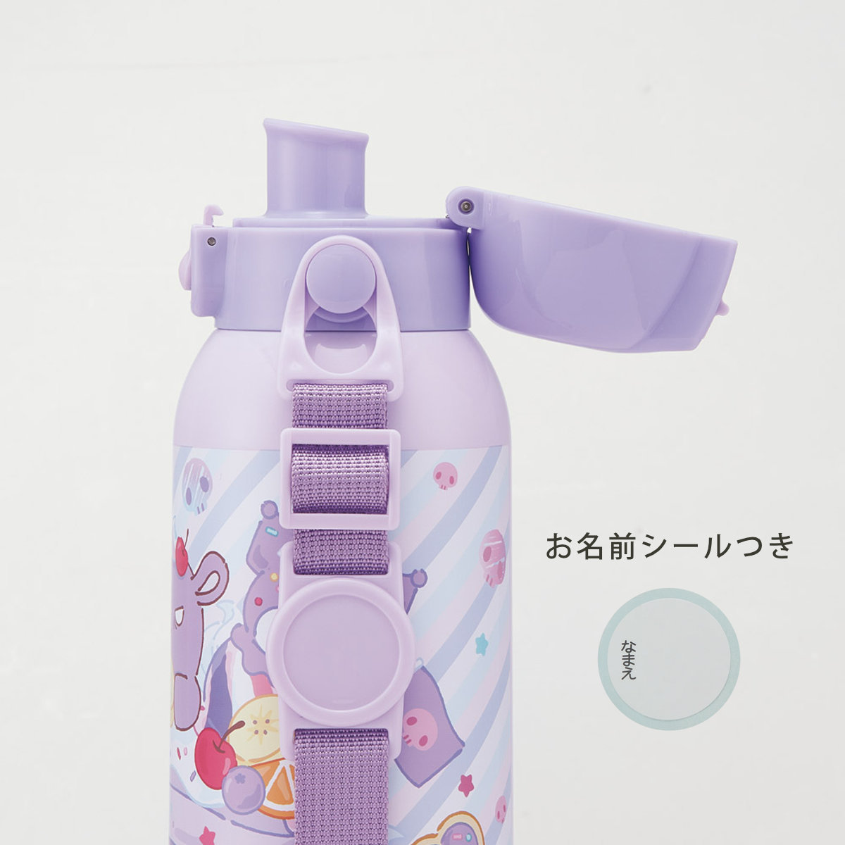 水筒の蓋はボタンを押すだけで開けることができるワンタッチ式。さらに持ち運びに安心のロック機能付きです。