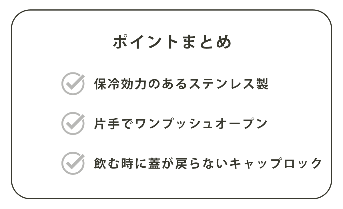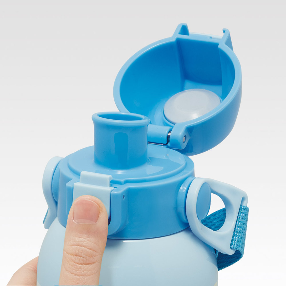 水筒の蓋はボタンを押すだけで開けることができるワンタッチ式。さらに持ち運びに安心のロック機能付きです。