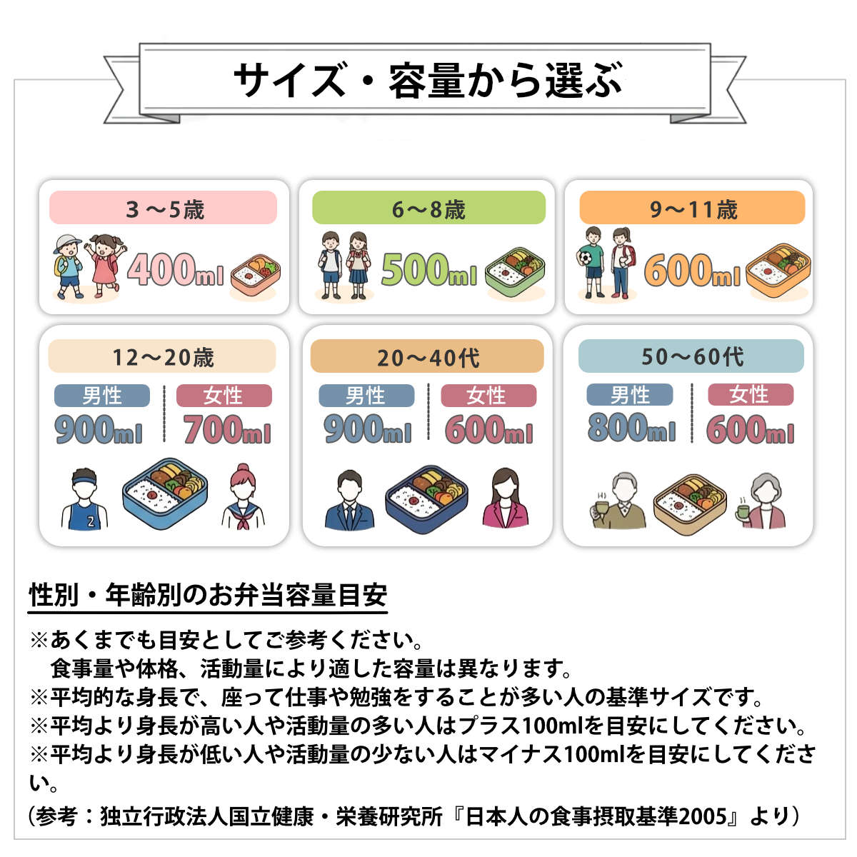 幼稚園や小学校のお子様におすすめの500mlサイズのお弁当箱です。蓋は2点ロックでしっかりと閉められて安心して持ち運びいただけます。