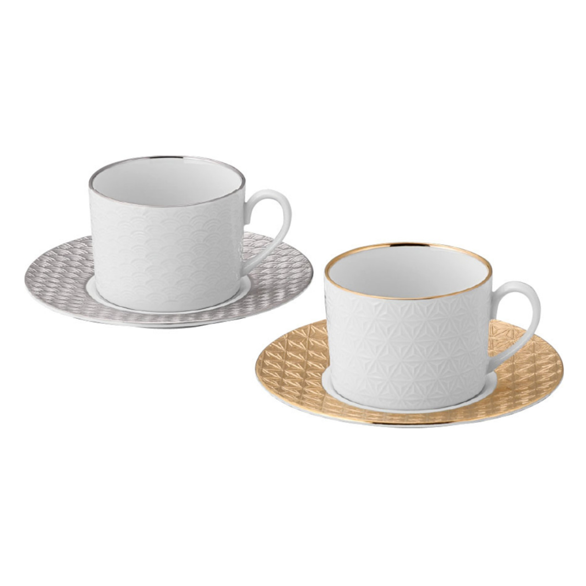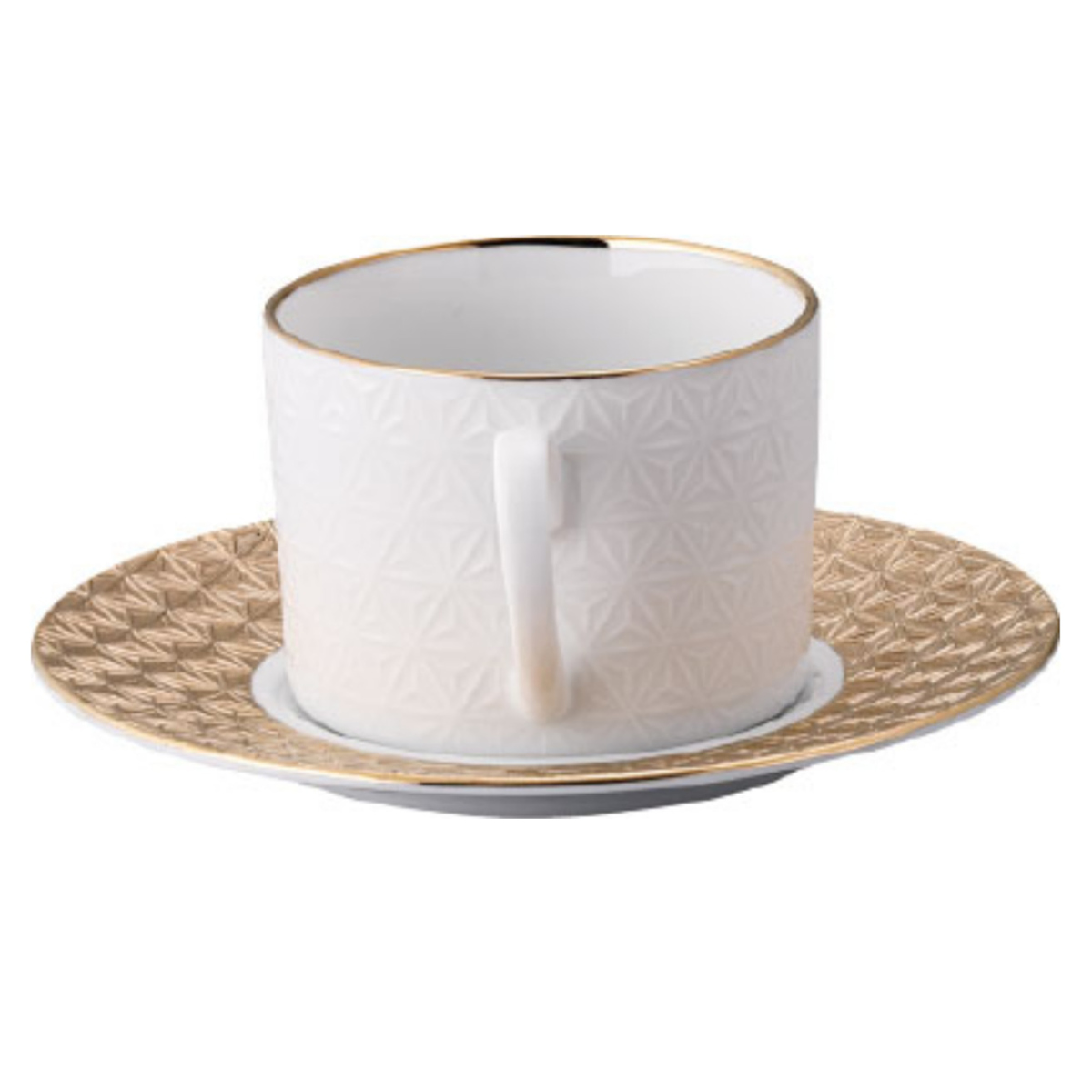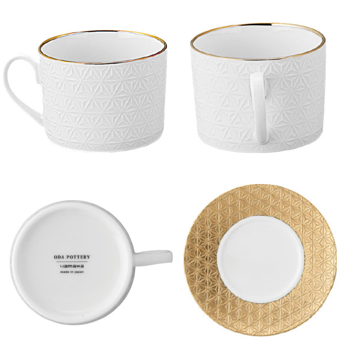 「黄金の国ジパング」をイメージした、華やかで上品なカップ&ソーサーのぺアセットです。日本の伝統柄である麻の葉と青海波を繊細な彫刻で表現し、金やプラチナで美しく装飾しています。カップの内側は透き通るような白磁で、飲み物の色合いをいっそう引き立てます。ハレの日の食卓を華やかに彩り、お祝いの贈り物にもぴったりです。