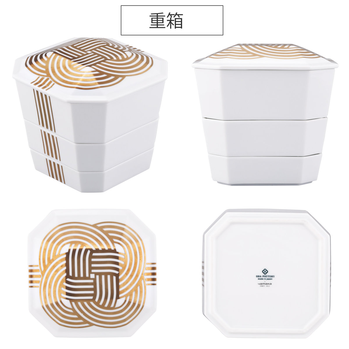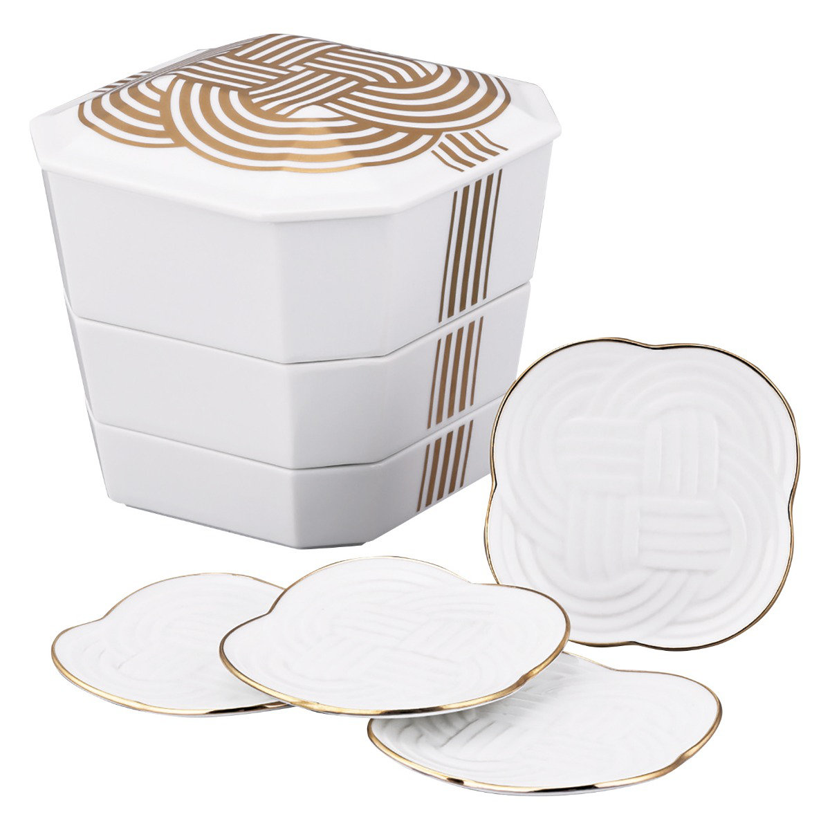 ●縁起の良い「結び」の文様を金で絵付けした、特別な日を彩る磁器製の重箱と小皿4枚セットです。
