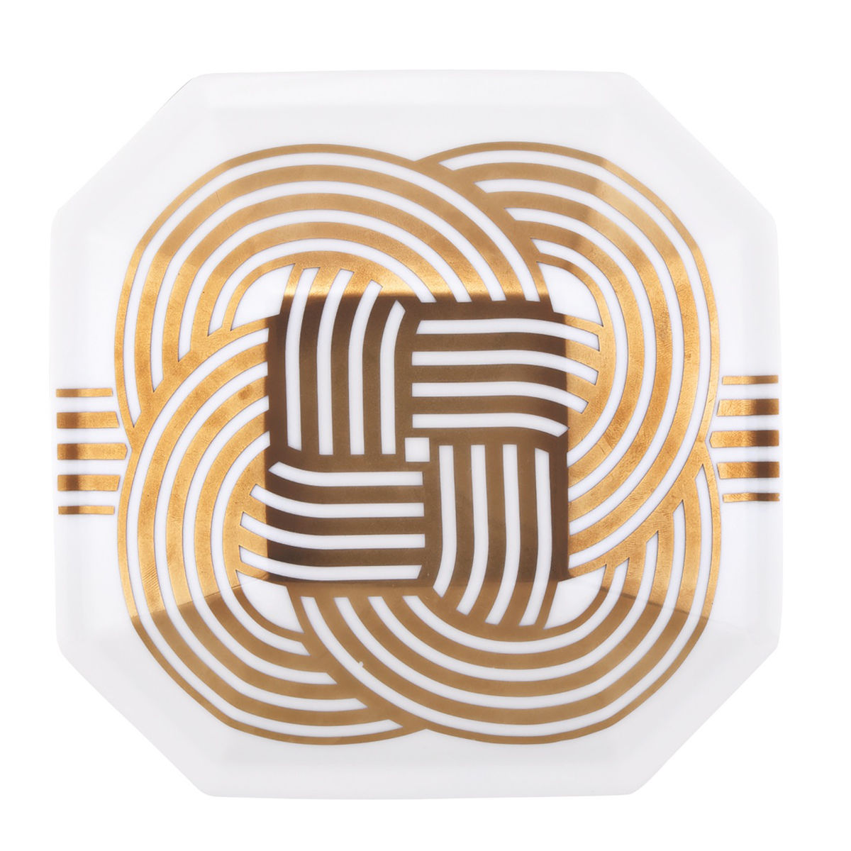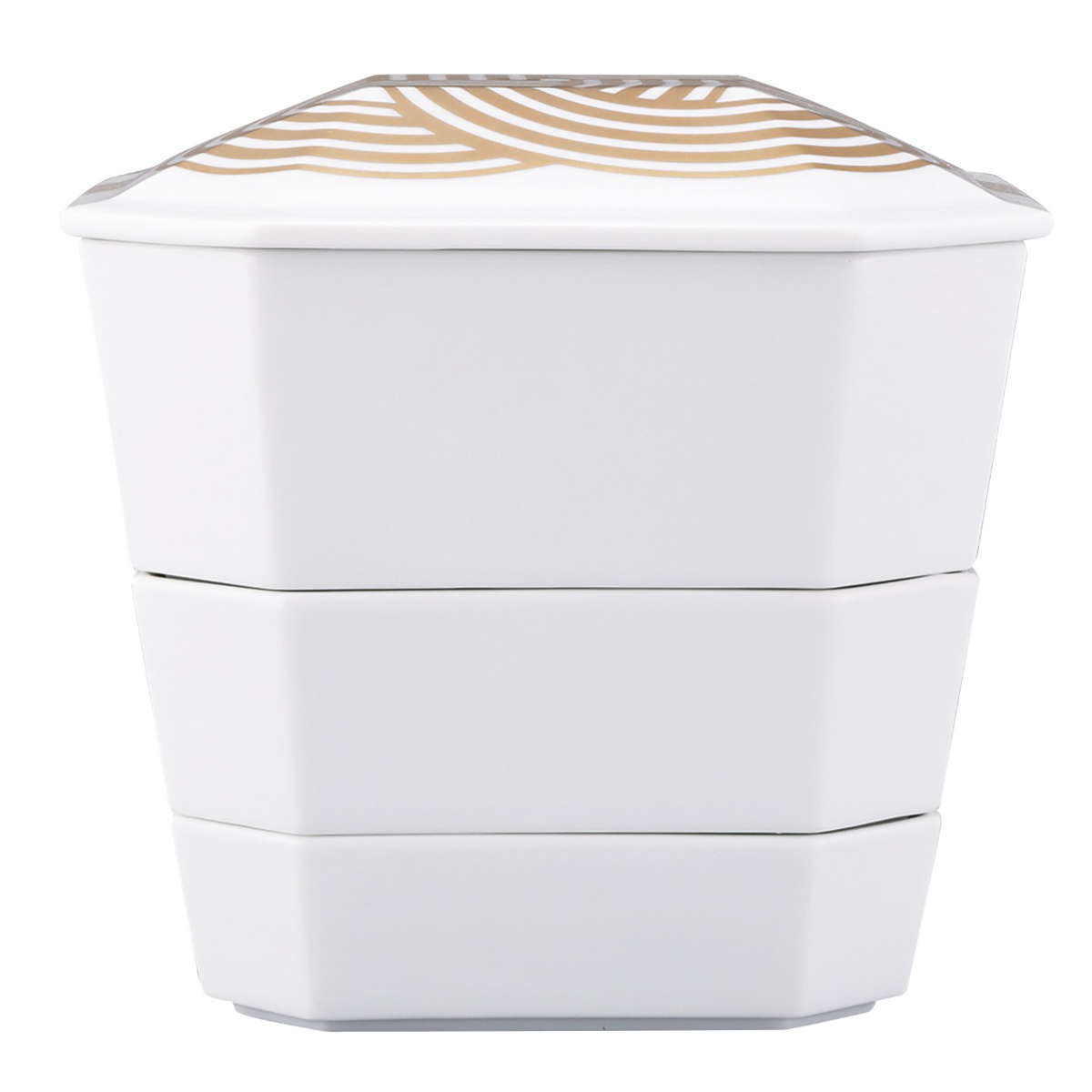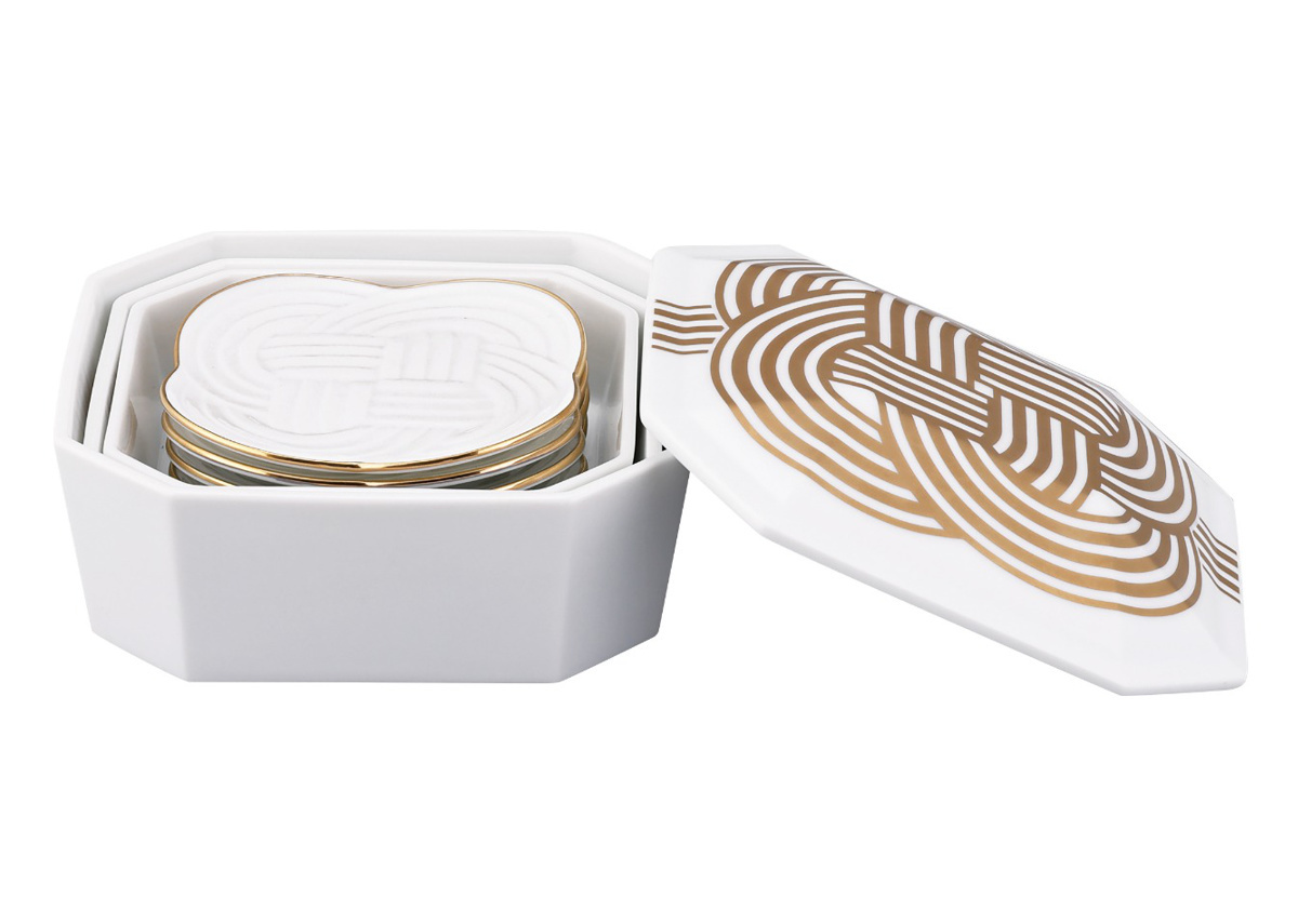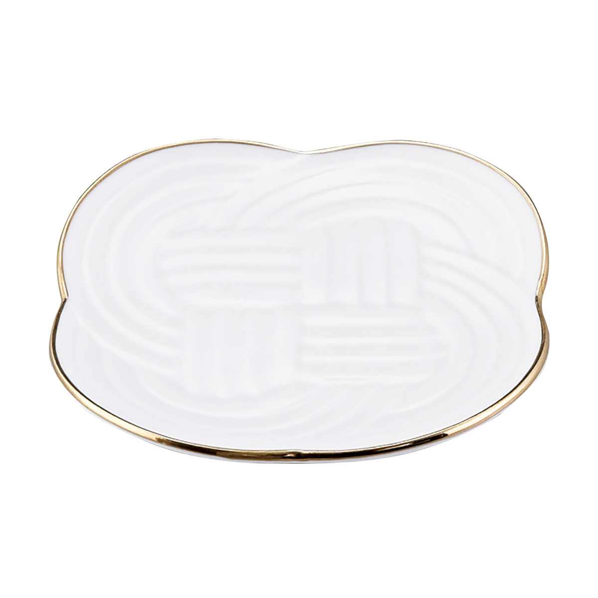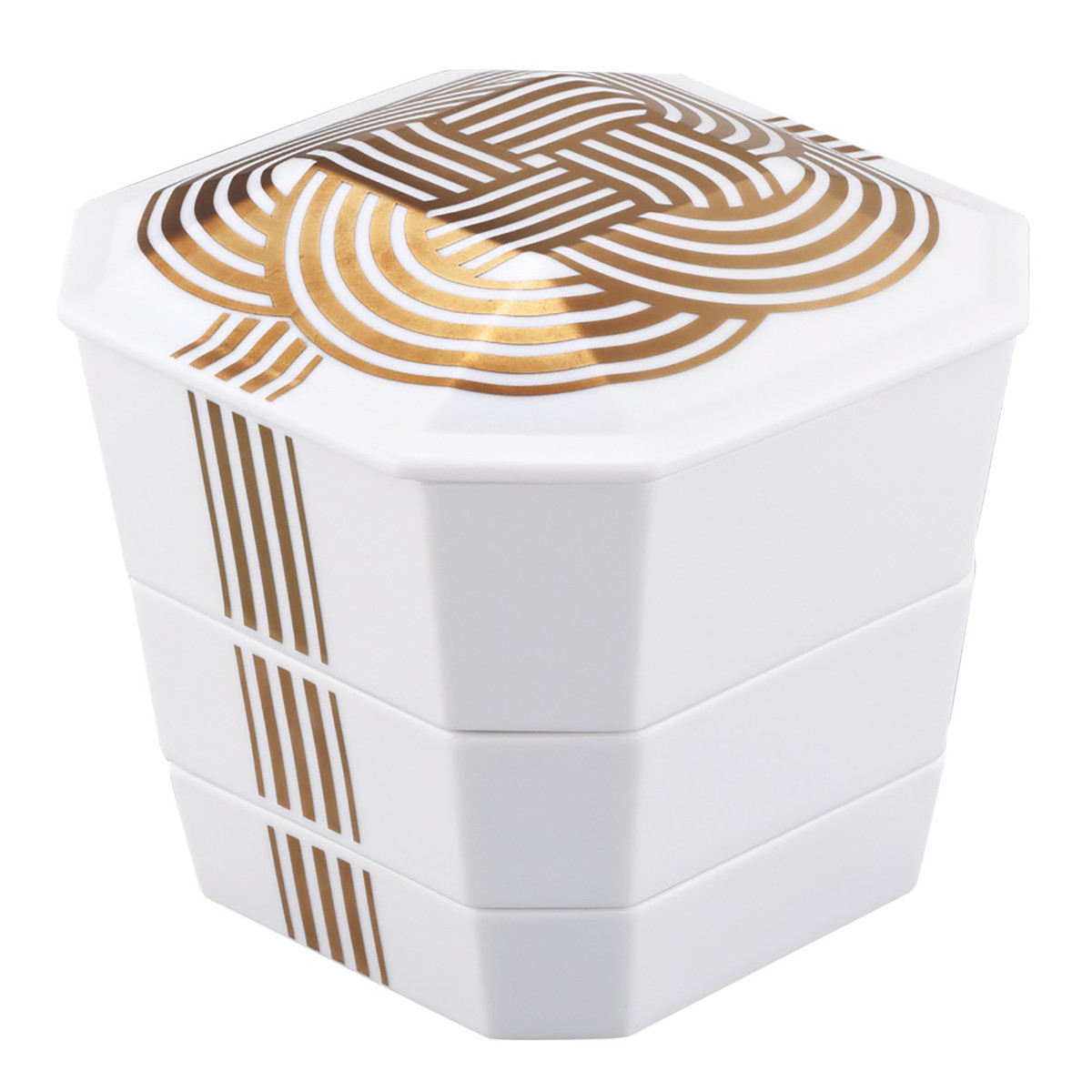 縁起の良い「結び」の文様を金で絵付けした、特別な日を彩る磁器製の重箱と小皿4枚セットです。古くから日本では、「結ぶ」という行為や文様はおめでたいものとされてきました。お祝いの席やお正月のおせち料理にぴったりで、お料理をいっそう華やかに引き立てます。小皿は取り皿としてもお使いいただけます。