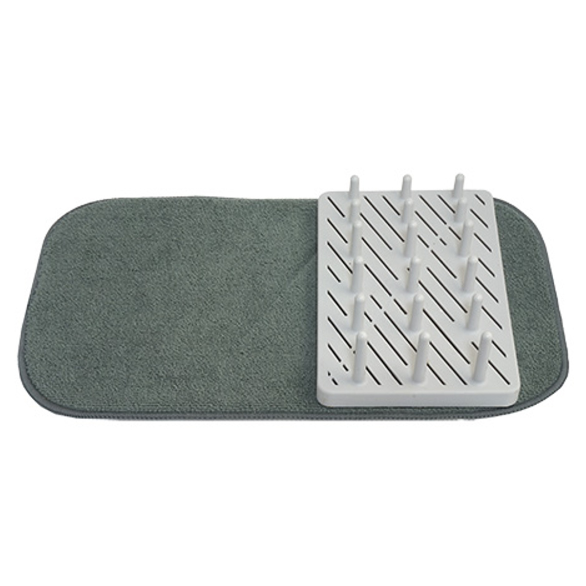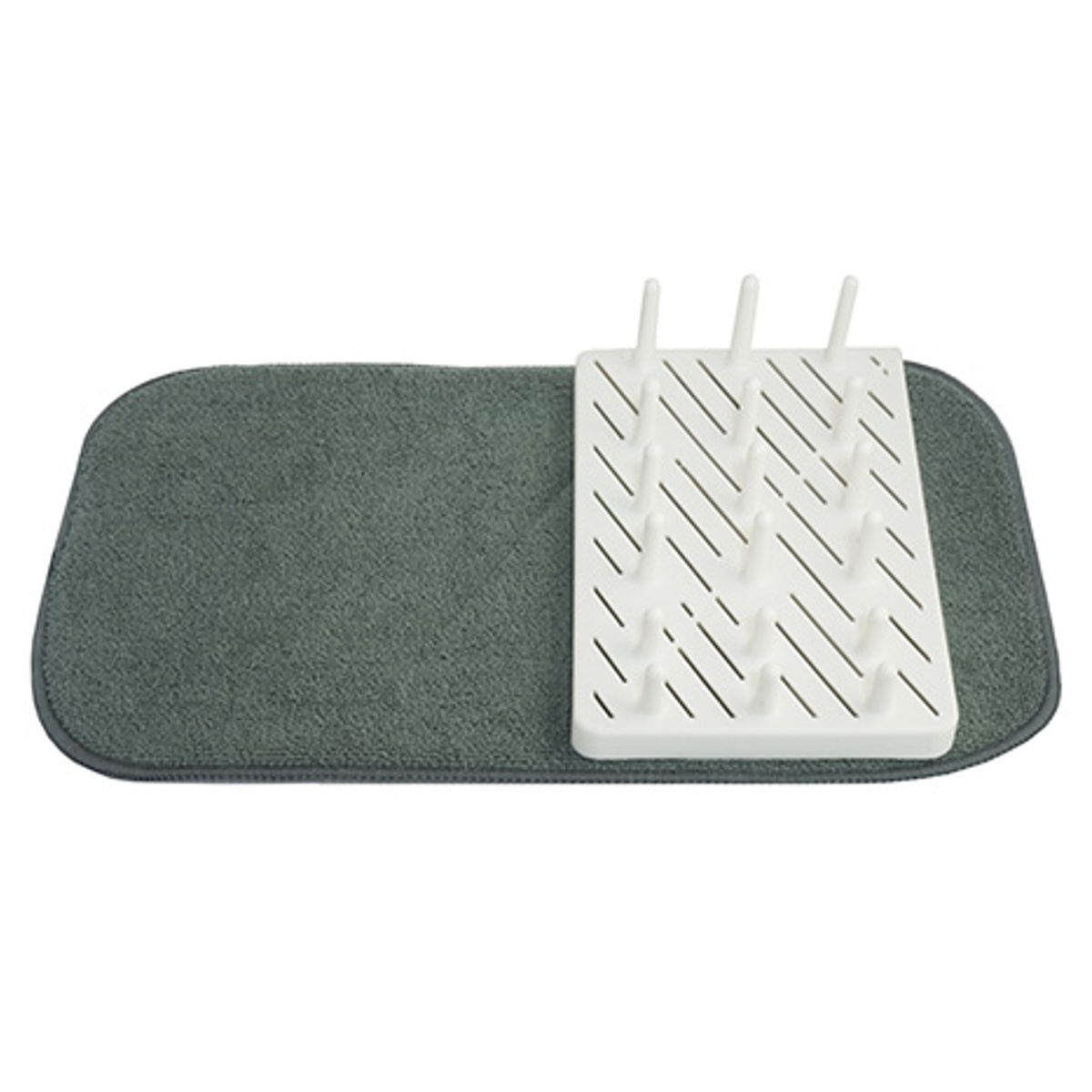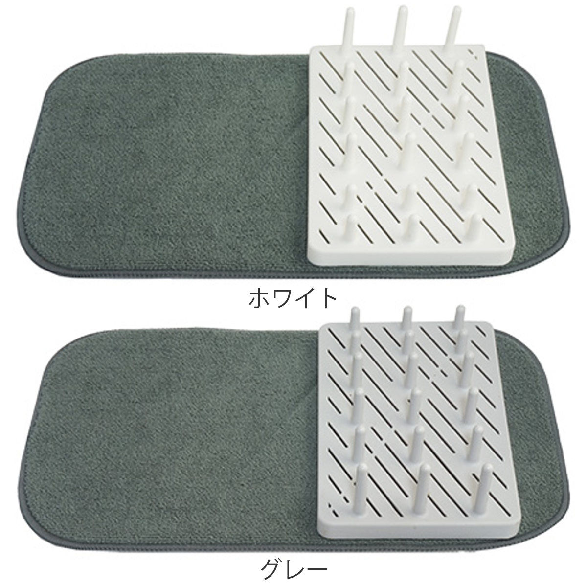 コンパクトで置き場所を選ばない、水切りプレートスタンドと吸水マットのセットです。お皿はプレートスタンドに立てて乾かせるので省スペースで使えます。お鍋やコップは吸水マットの上にそのまま置いて水切りでき、洗った食器をまとめて乾かせて便利にお使いいただけます。