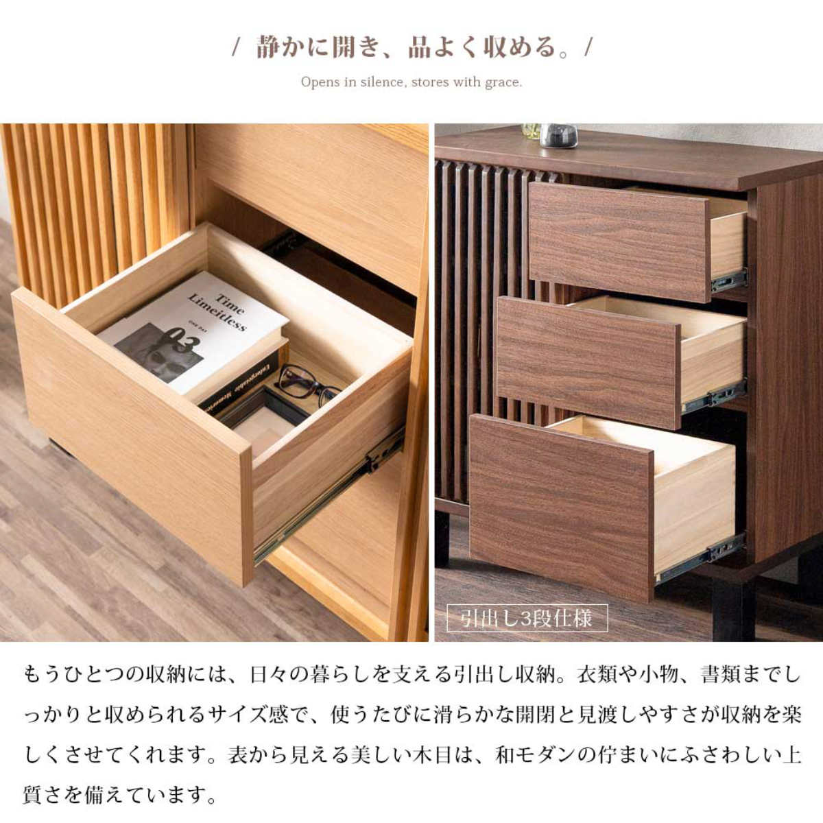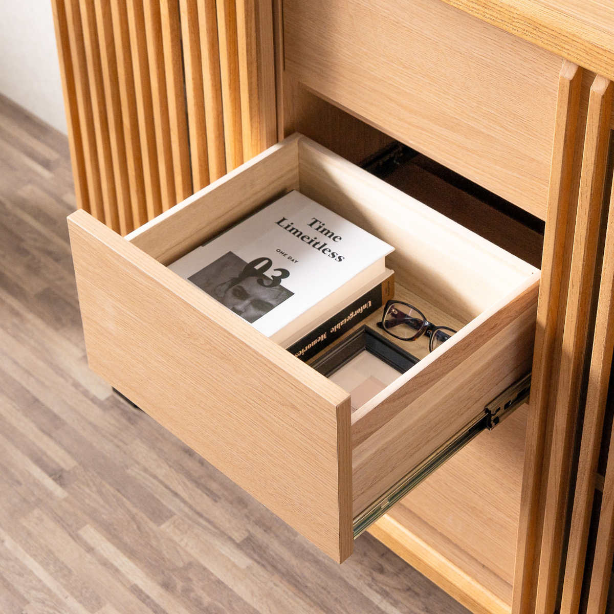 リビング周りの小物の収納に最適な引出しは、フルスライドレール仕様で奥までしっかりと見渡せます。たっぷり収納しても開閉がスムーズです。