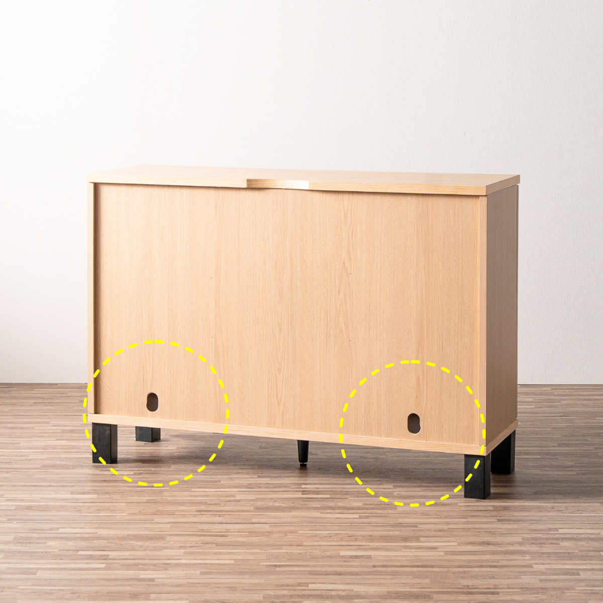背面まで美しい仕上げで、壁際だけでなくお部屋の中央に置いて間仕切りとしてもお使いいただけます。背板には配線穴が設けられているので、ルーター等のコードを背面に通すことができます。