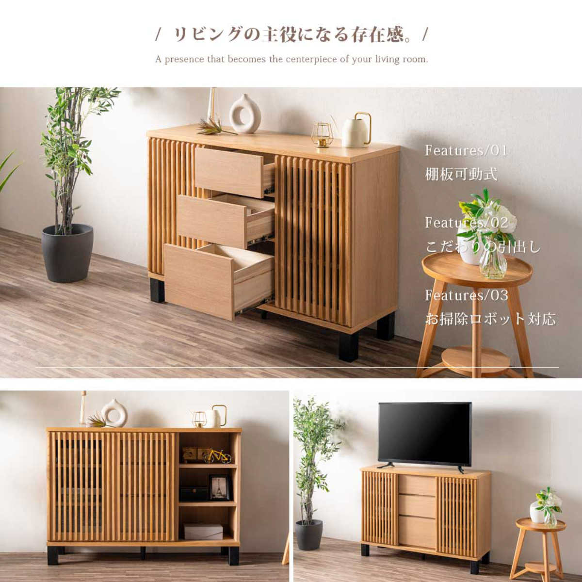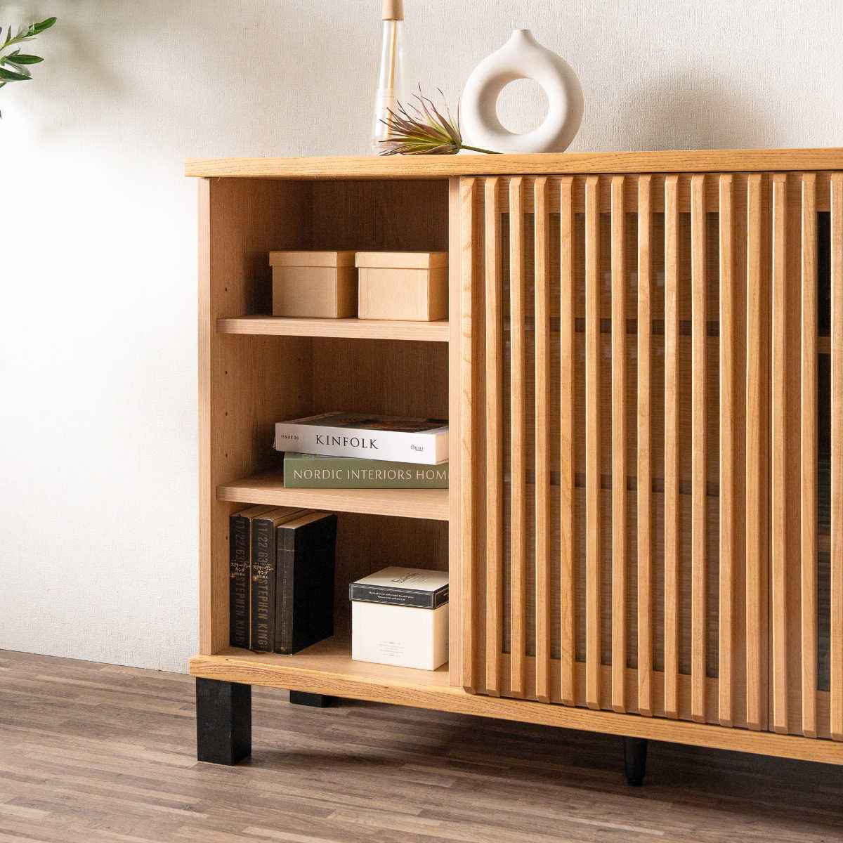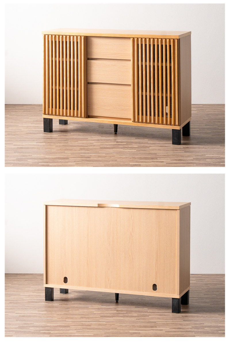 環境に配慮したFSC認証を取得した天然木工芸突板を使用したサイドボードです。前板のルーバーデザインが圧迫感を軽減し、お部屋を優しい雰囲気にコーディネートしてくれます。背面は化粧仕上げが施され、細部まで手を抜かず、丹精込めて製造されています。