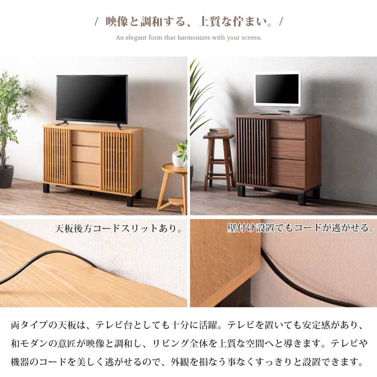 天板耐荷重は約60kgで、ハイタイプのテレビ台としても安心してお使いいただけます。引き戸のルーバー部の内側にはガラスが入っているので、扉を閉めたままでもリモコンの操作が可能です。棚板後方に隙間を設け、コードを通せるように設計されています。