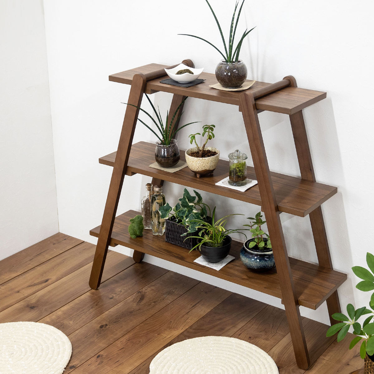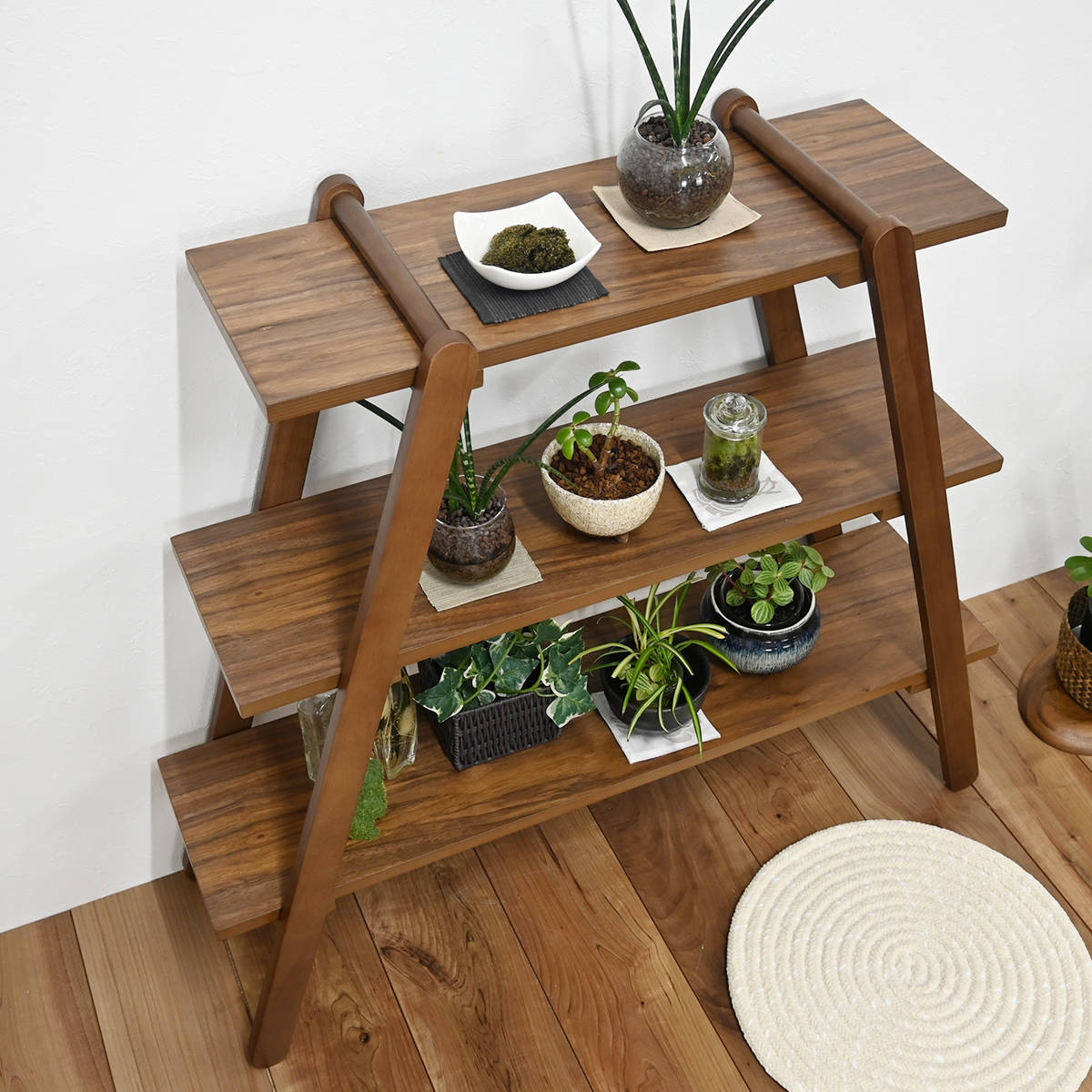 斜め脚のすっきりとしたフォルムで、置くだけで空間のアクセントになります。リビングや寝室、玄関など、さまざまな場所で活躍します。また、棚板の下にも空間があるため、たっぷりと収納できます。