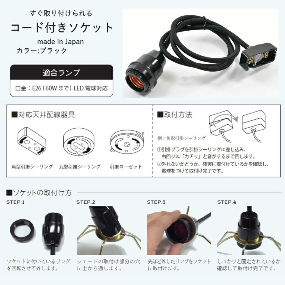 ●すぐ取り付けられる、コード付きソケットです。
