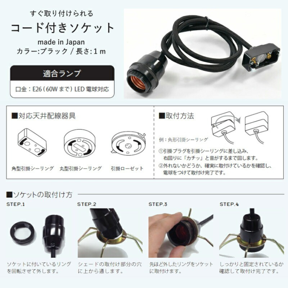 ●すぐ取り付けられる、コード付きソケットです。