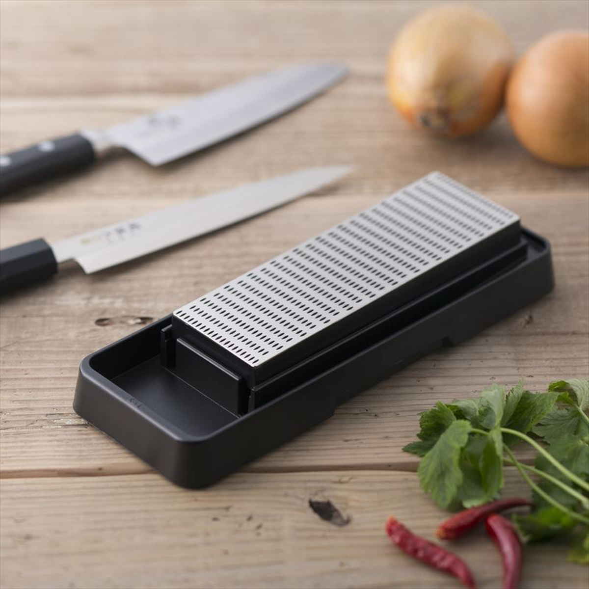 ステンレス、鋼、セラミック、チタン包丁に使える砥石です。超微粒のダイヤモンドを使用しているので、一般的なシャープナーよりも研磨力が高く、鋭い切れ味がスピーディーに蘇ります。また、水なしでも研ぎが行えるので、後片付けがラクチンなのも嬉しいポイントです。
