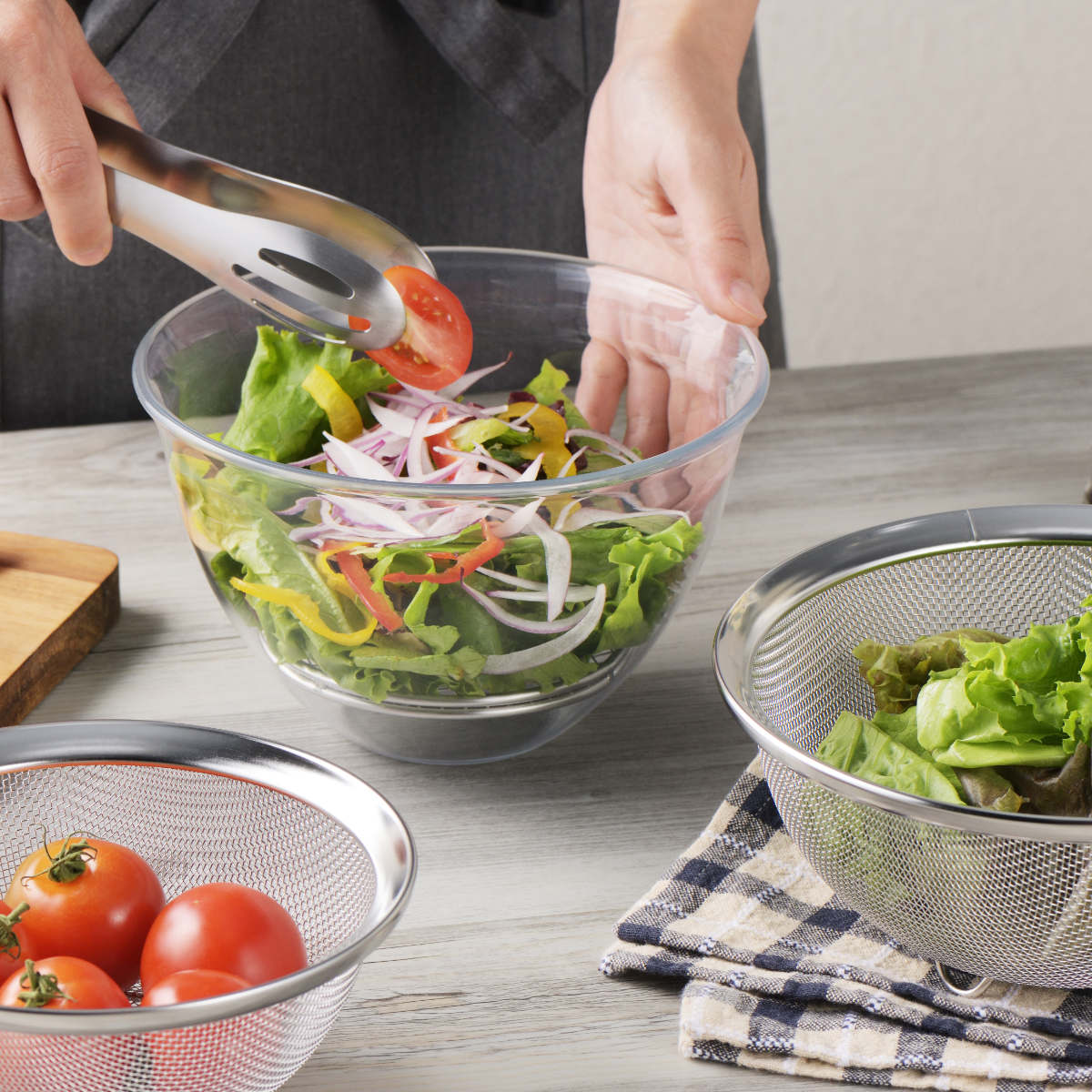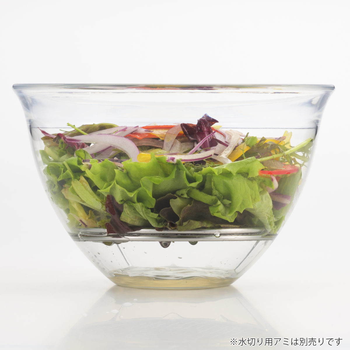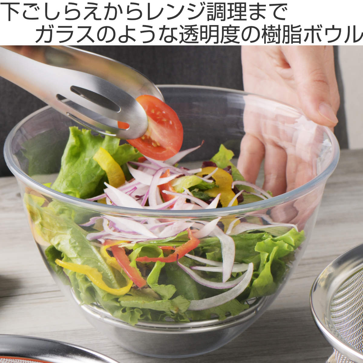 ガラスのような透明度の樹脂ボウルです。透明で中が見えるので食材の混ざり具合や分量が分かりやすく、調理がスムーズに進みます。軽量で扱いやすく、毎日の下ごしらえに便利です。