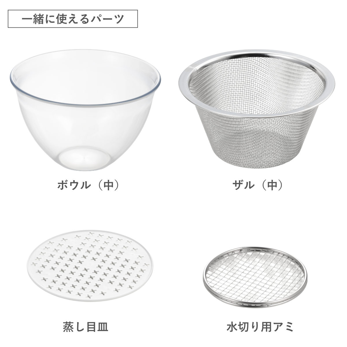 suiroの【ザル(中)】を重ねて使えば、食材を洗って水切りし、そのまま和え作業まで行えます。【水切り用アミ】を使えば、野菜や果物の水切りに便利です。