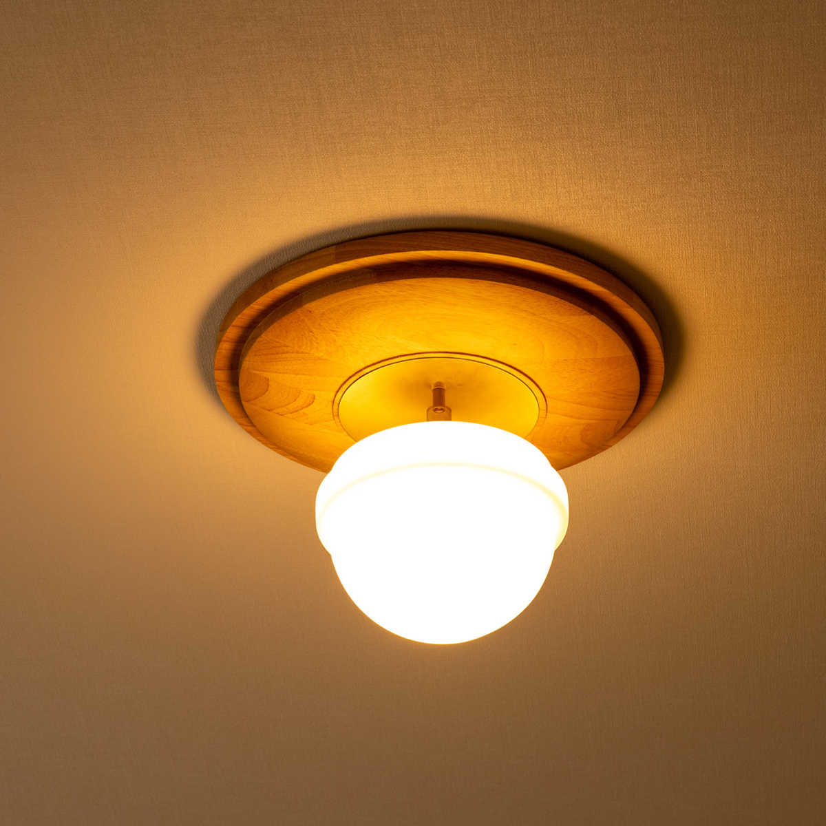 美しい曲線を描くフロストガラスのシェードと、繊細な装飾を施したウッドプレート。 やわらかな丸みを帯びたフォルムが、空間に上品で落ち着いた印象をもたらします。 モダンにもクラシカルにも自然に調和する、洗練されたシーリングライトです。