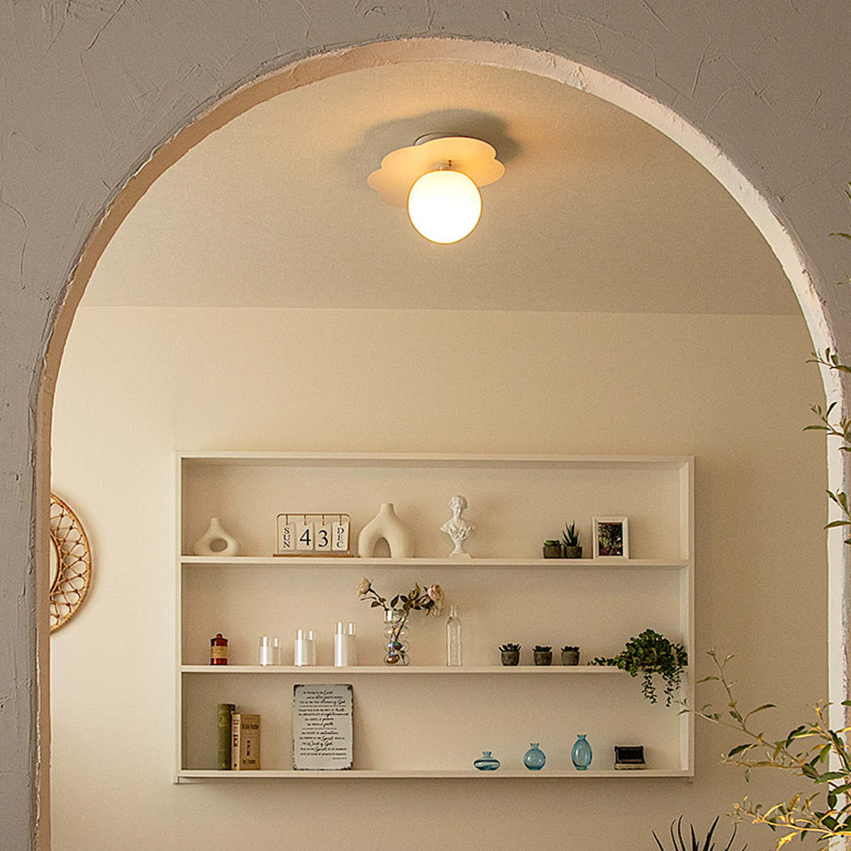 やわらかな曲線を描く雲型ベースに、丸いフロストガラスを組み合わせた印象的な佇まい。 雲の合間から月がそっとのぞくような、幻想的で穏やかな表情が空間に静かなアクセントを添えます。