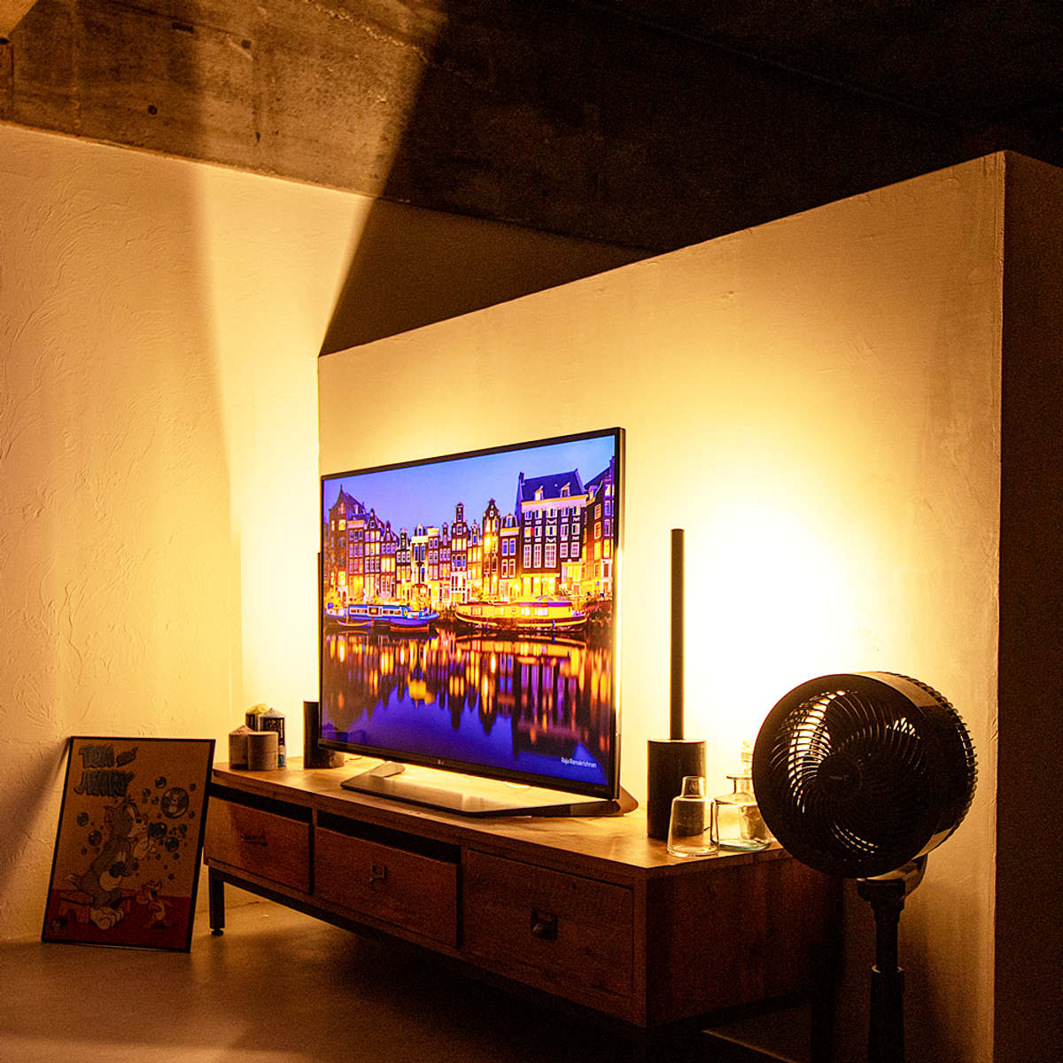 玄関や飾り棚などちょっとした空間のディスプレイや、アートポスターを照らしたり、壁やコーナーに向けて空間を広く見せる演出にと様々な使い方で楽しめます。また、デスクの PCモニター裏を照らすと、目に優しく明るさを補助します。2台使いではテレビの左右に置いて、憧れのシアターライティングにもおすすめです。