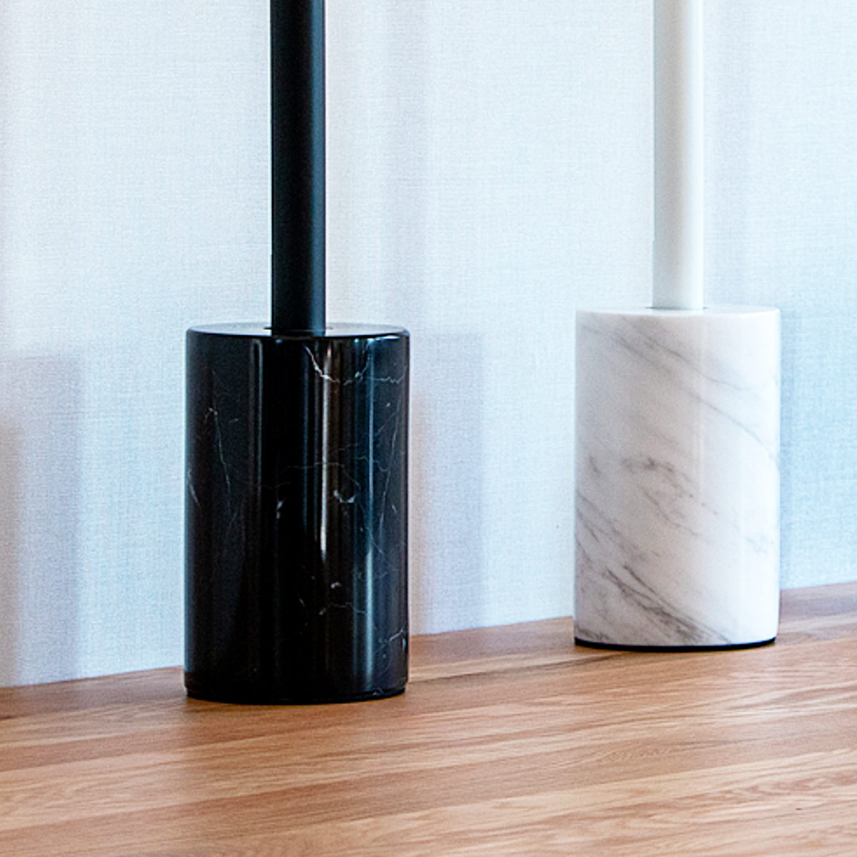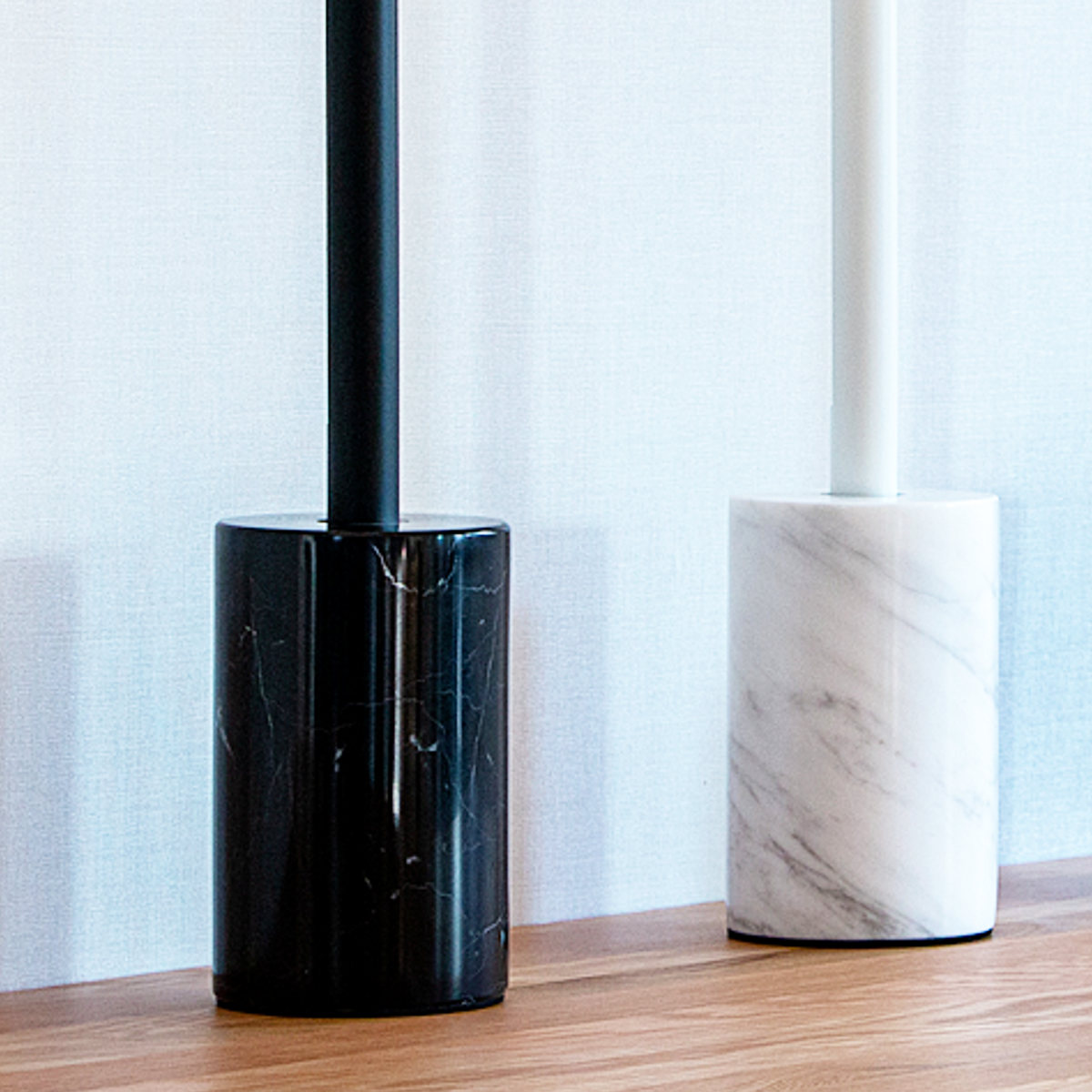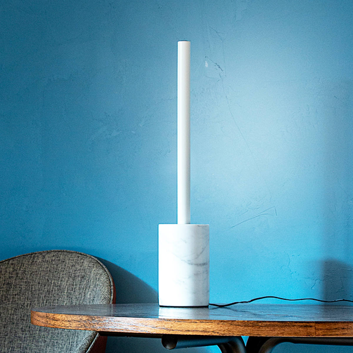 重厚感のある円柱フォルムの大理石のベース。単調になりがちなベーシックカラーも大理石のマーブル模様が静かなアクセントとなり、シンプルな美しさを引き立てます。