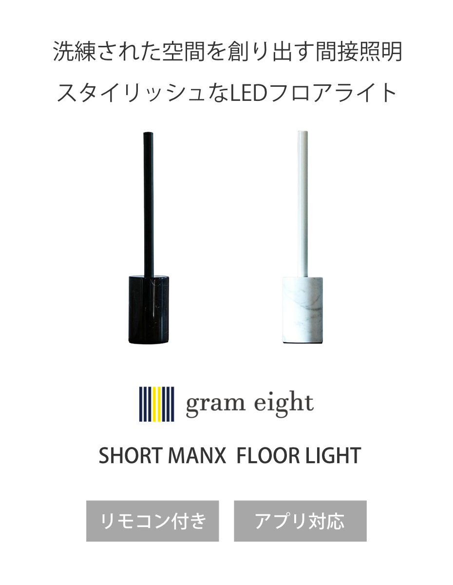 2023年にグッドデザイン賞を受賞したLEDフロアライト NEO MANX (ネオマンクス)をコンパクトサイズに仕上げたショートモデル「SHORT MANX (ショートマンクス)」です。 大理石製のたて置きベースとセットになったフロアライトタイプです。