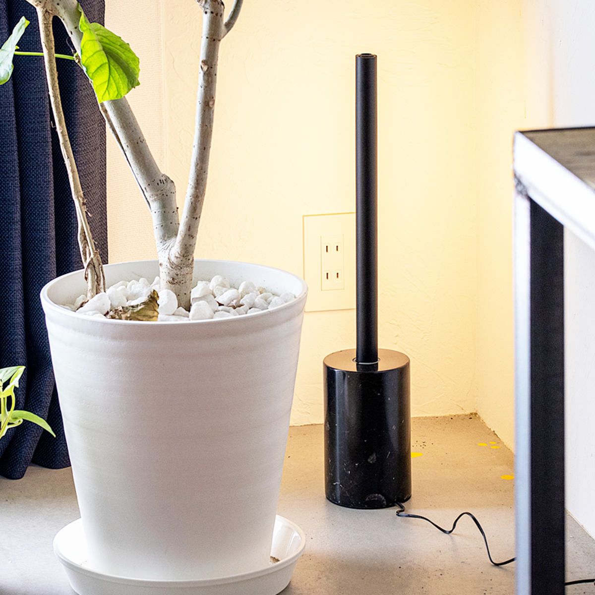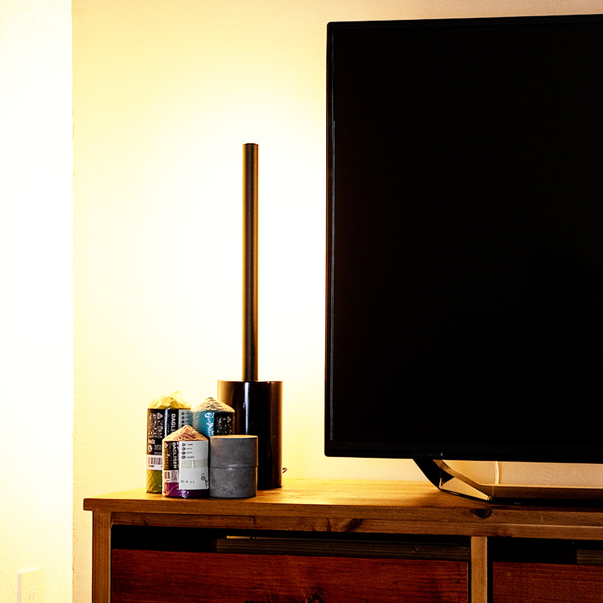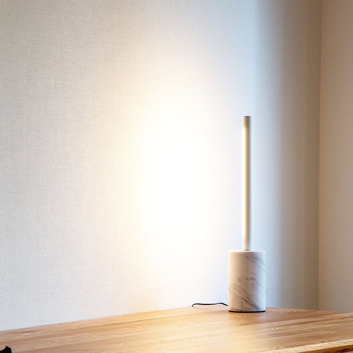 照明器具の直径は約2.5cm。極限まで細くしたスリムなサイズ感は、凛とした佇まいでテレビやソファ横に、ベッドサイドにと場所を選ばず空間にスッと馴染みます。
