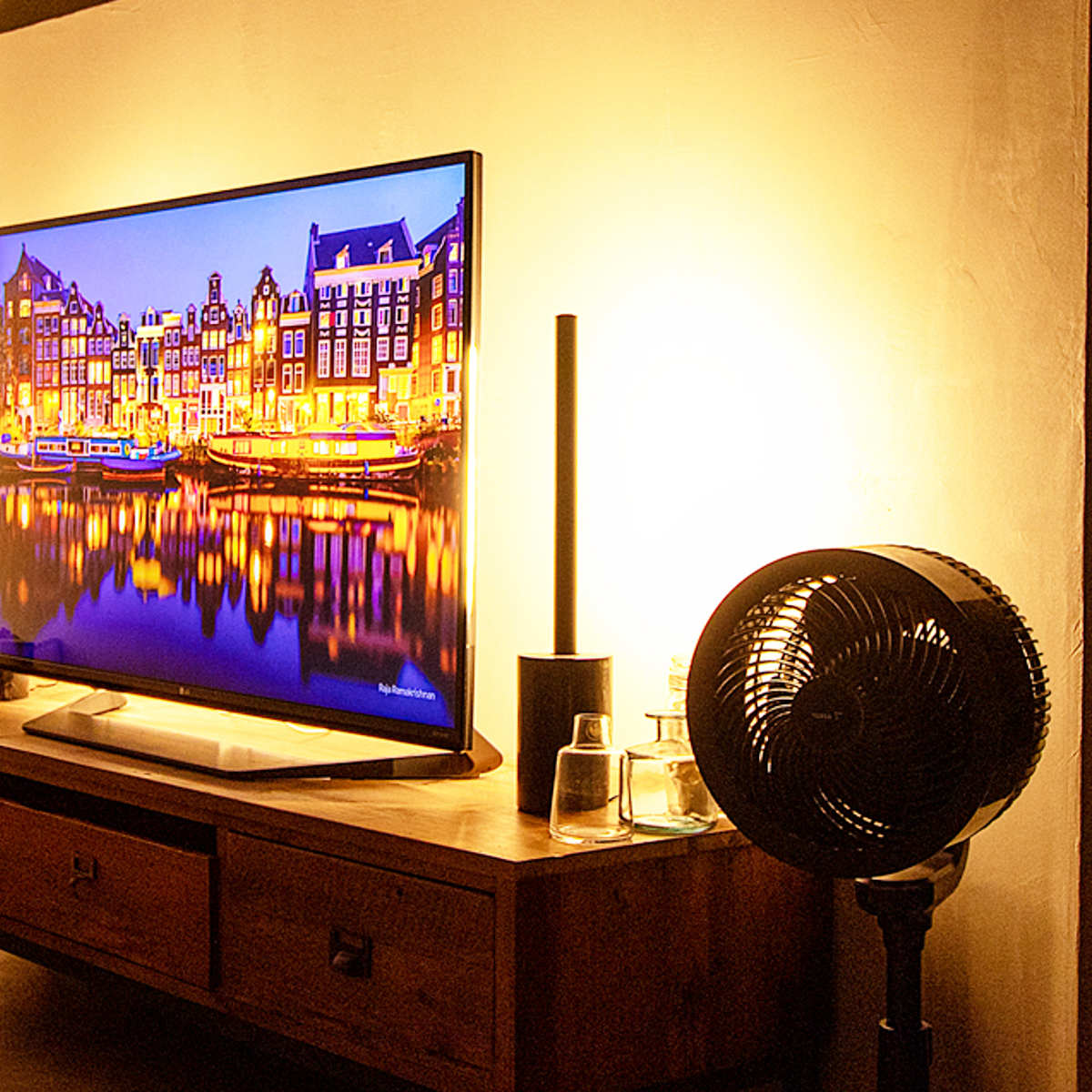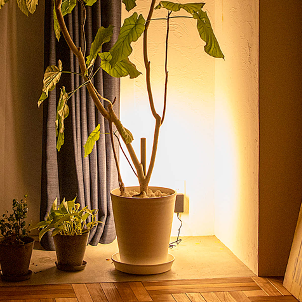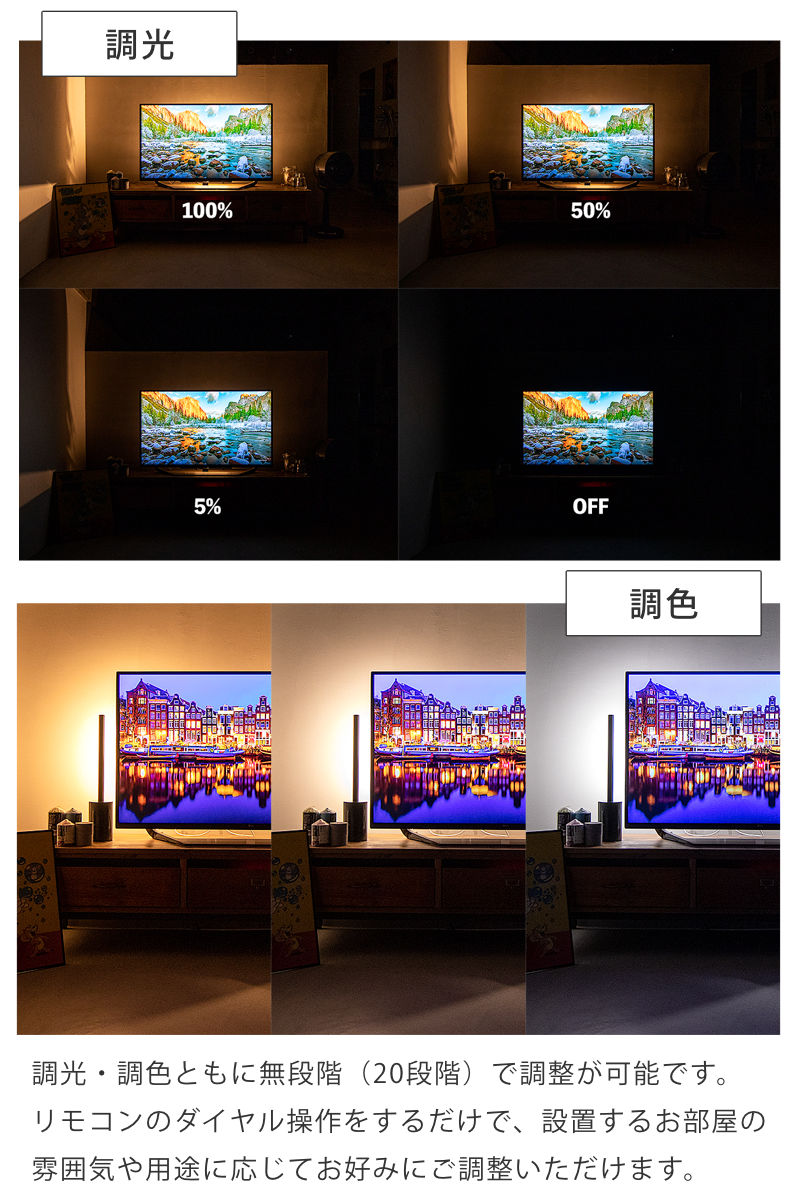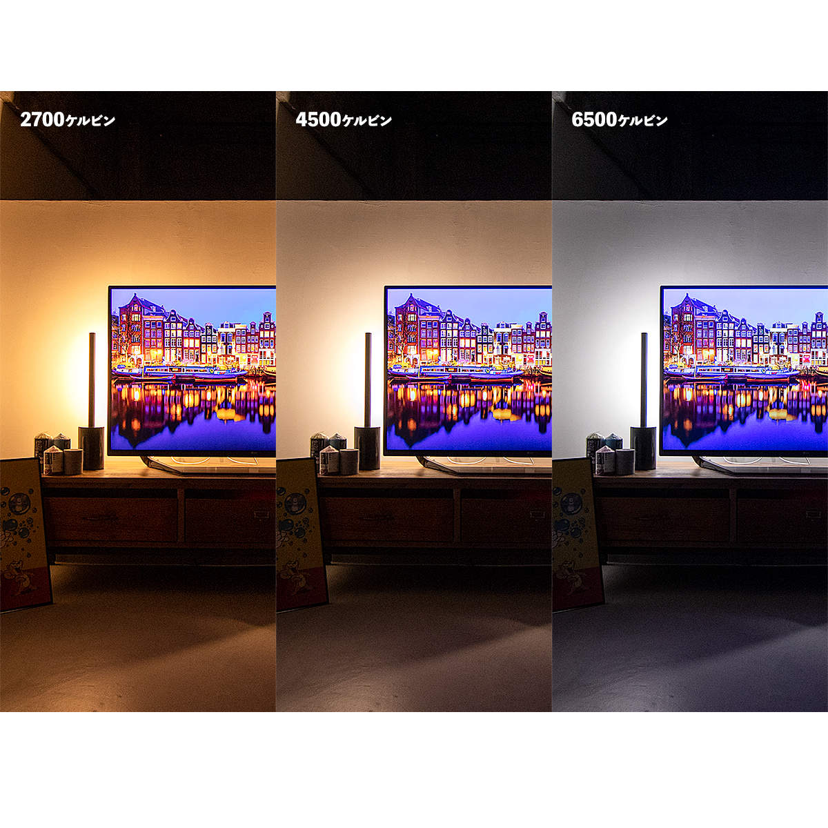 玄関や飾り棚などちょっとした空間のディスプレイや、アートポスターを照らしたり、壁やコーナーに向けて空間を広く見せる演出にと様々な使い方で楽しめます。また、デスクの PCモニター裏を照らすと、目に優しく明るさを補助します。2台使いではテレビの左右に置いて、憧れのシアターライティングにもおすすめです。