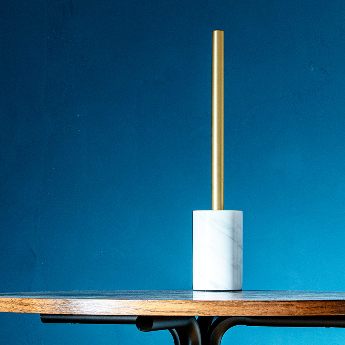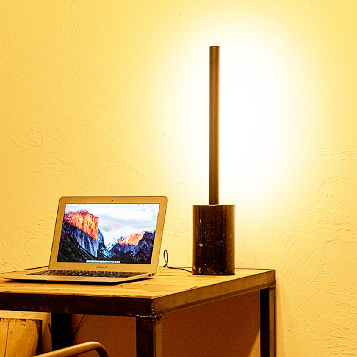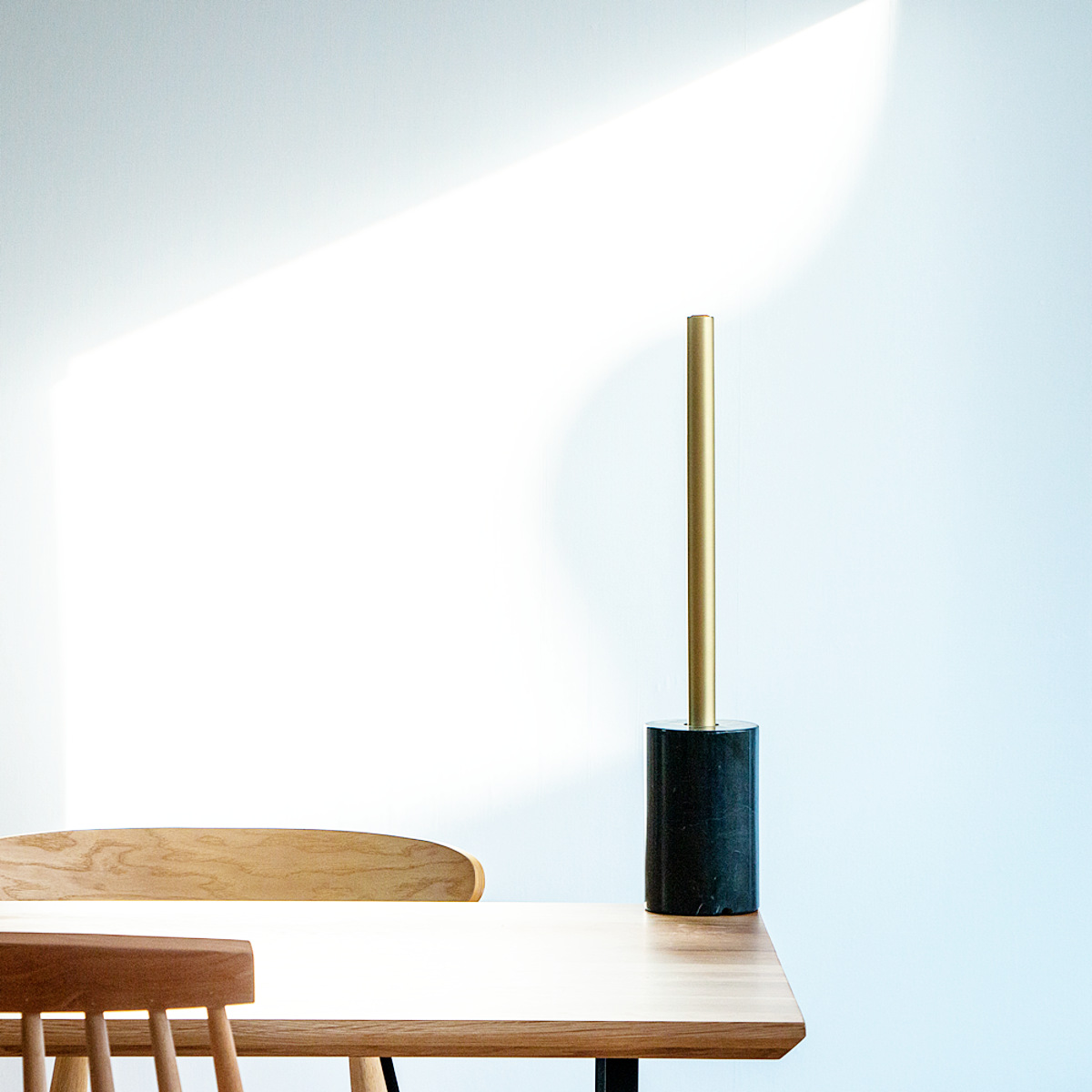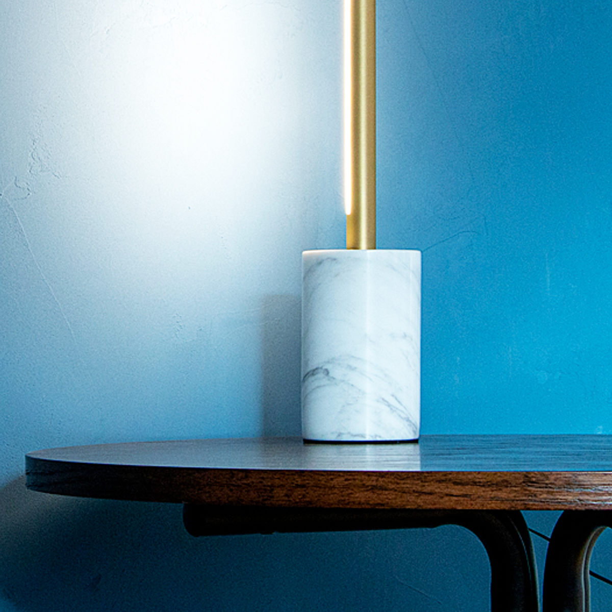 重厚感のある円柱フォルムの大理石のベース。単調になりがちなベーシックカラーも大理石のマーブル模様が静かなアクセントとなり、シンプルな美しさを引き立てます。