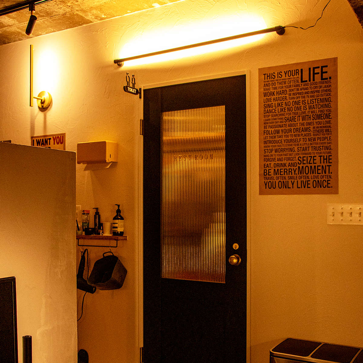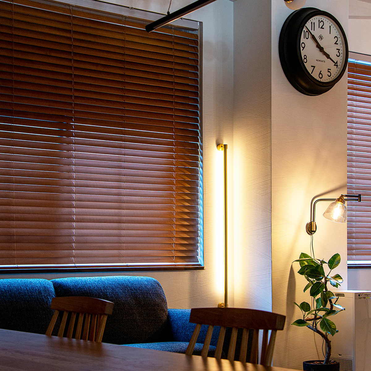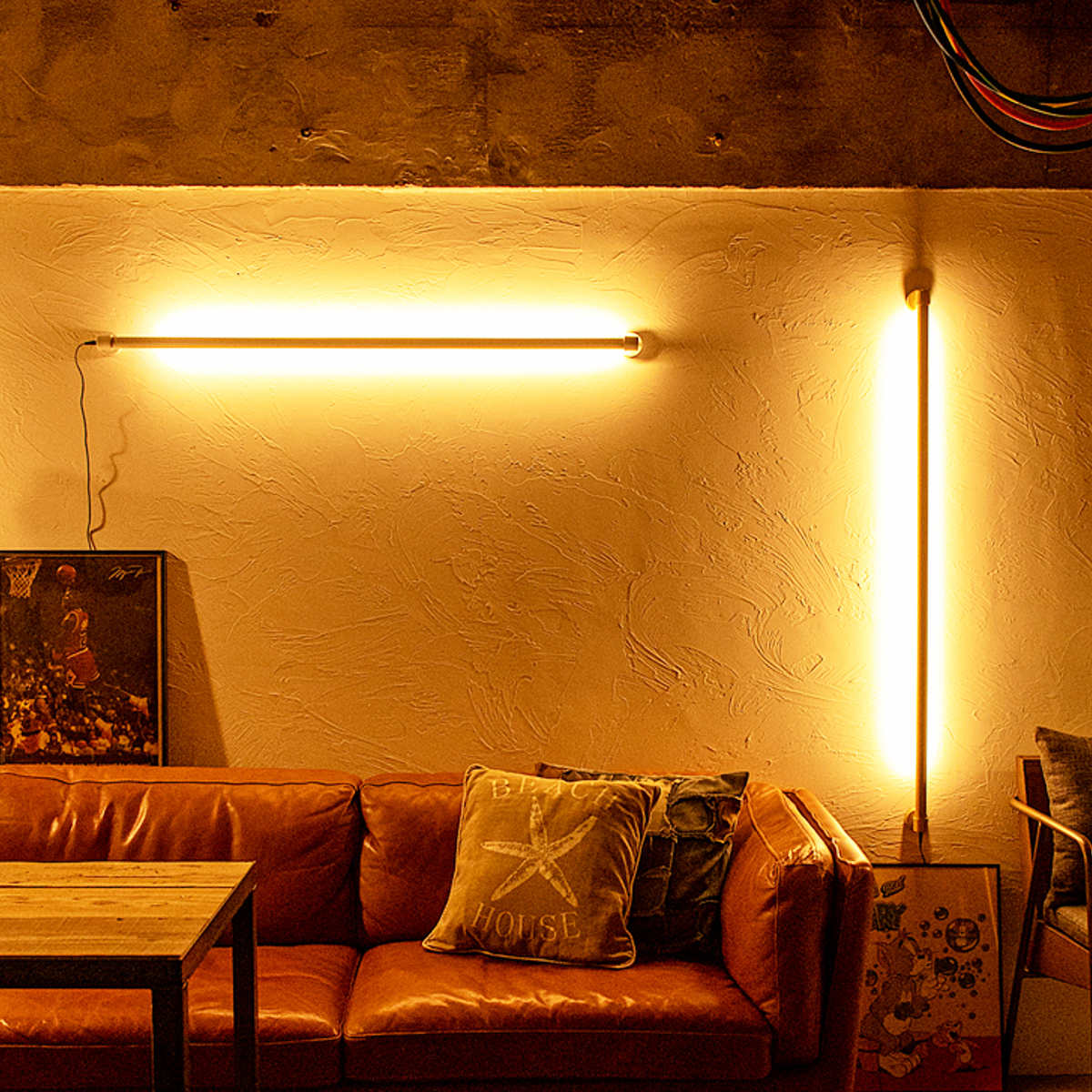 ライトを上向きに設置すれば、アッパーライトとして楽しめます。複数のライトを配置することで空間に立体感が生まれ、雰囲気のある空間に。メインのシーリングライトがなくても、夜に過ごす程度なら十分な明るさです。