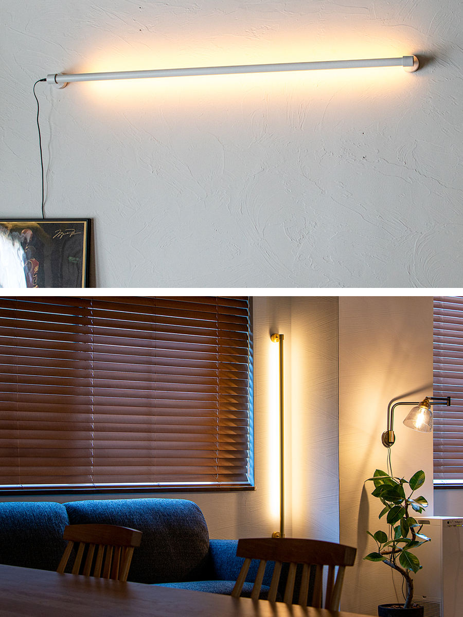直径約2.5cmの細いスチール管にマットな塗装を施したLEDバーライト。他にはないシンプルなデザインです。スタイリッシュという言葉がよく似合います。本体の半分弱が光る仕組み。間接光を使えば眩しさを抑えられ落ち着いた雰囲気になります。