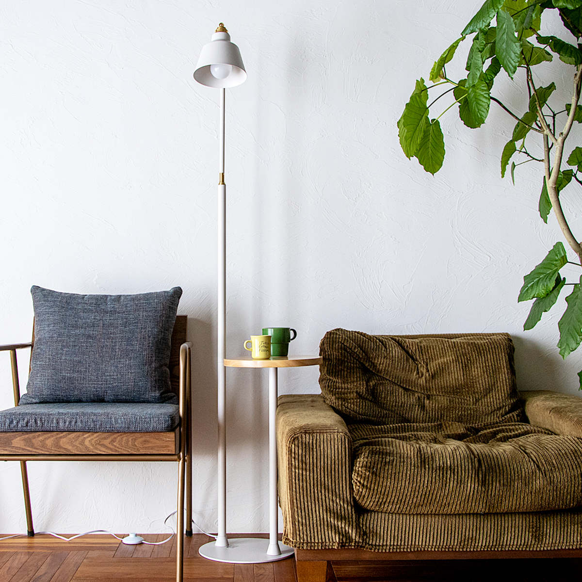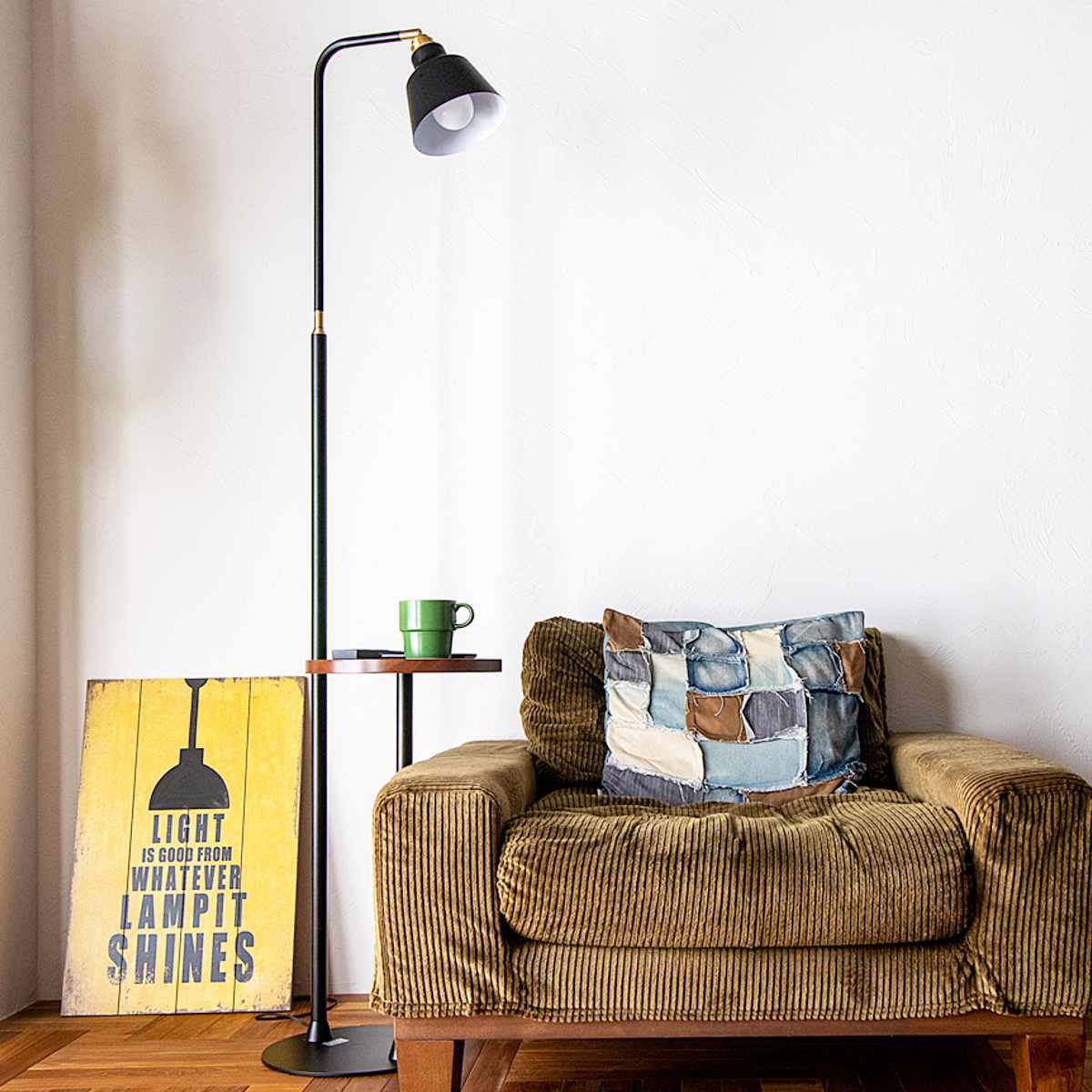 照明とサイドテーブルが一体になった、新しいスタイルのフロアライト。