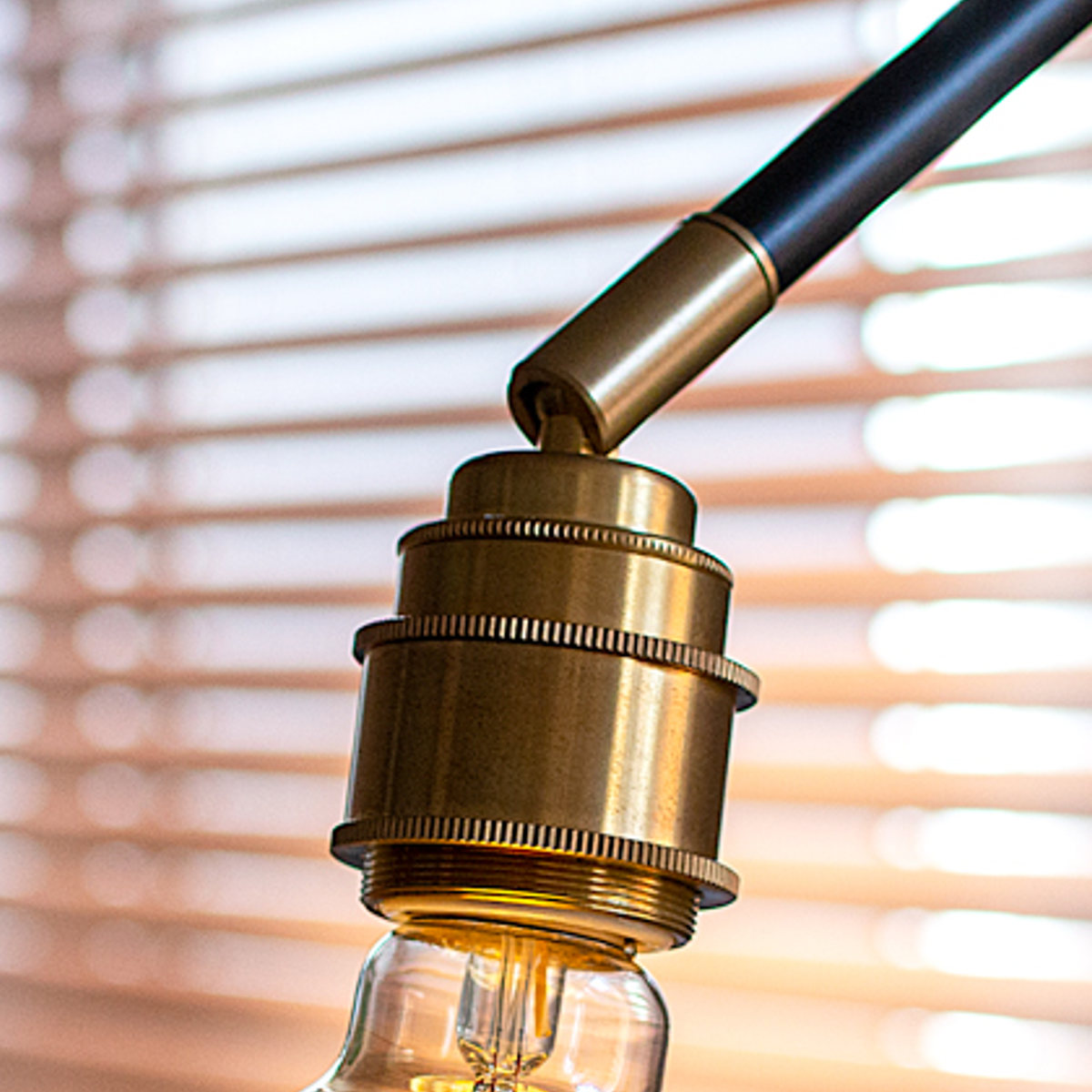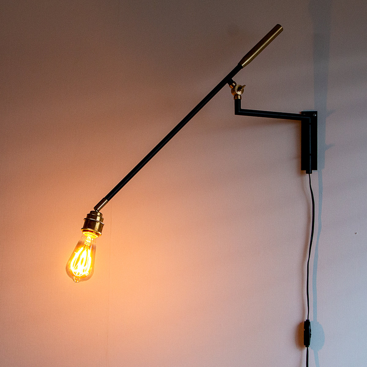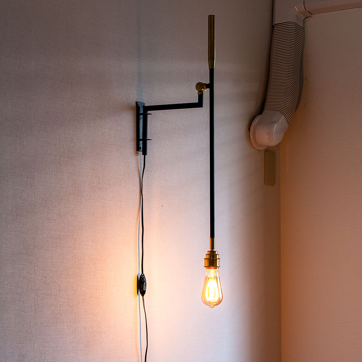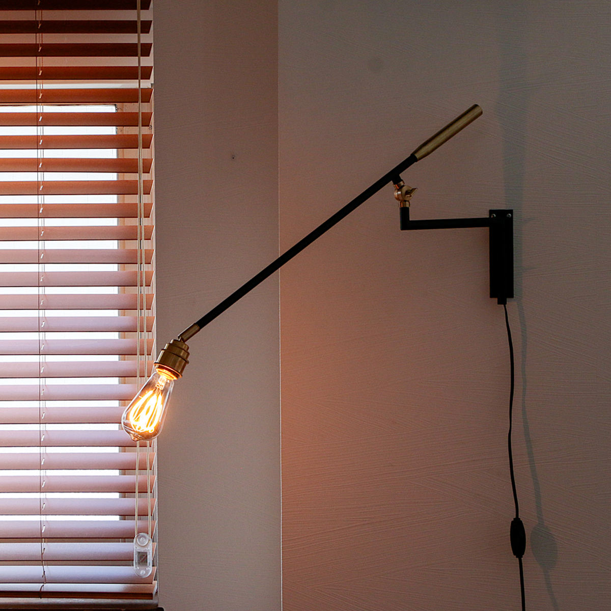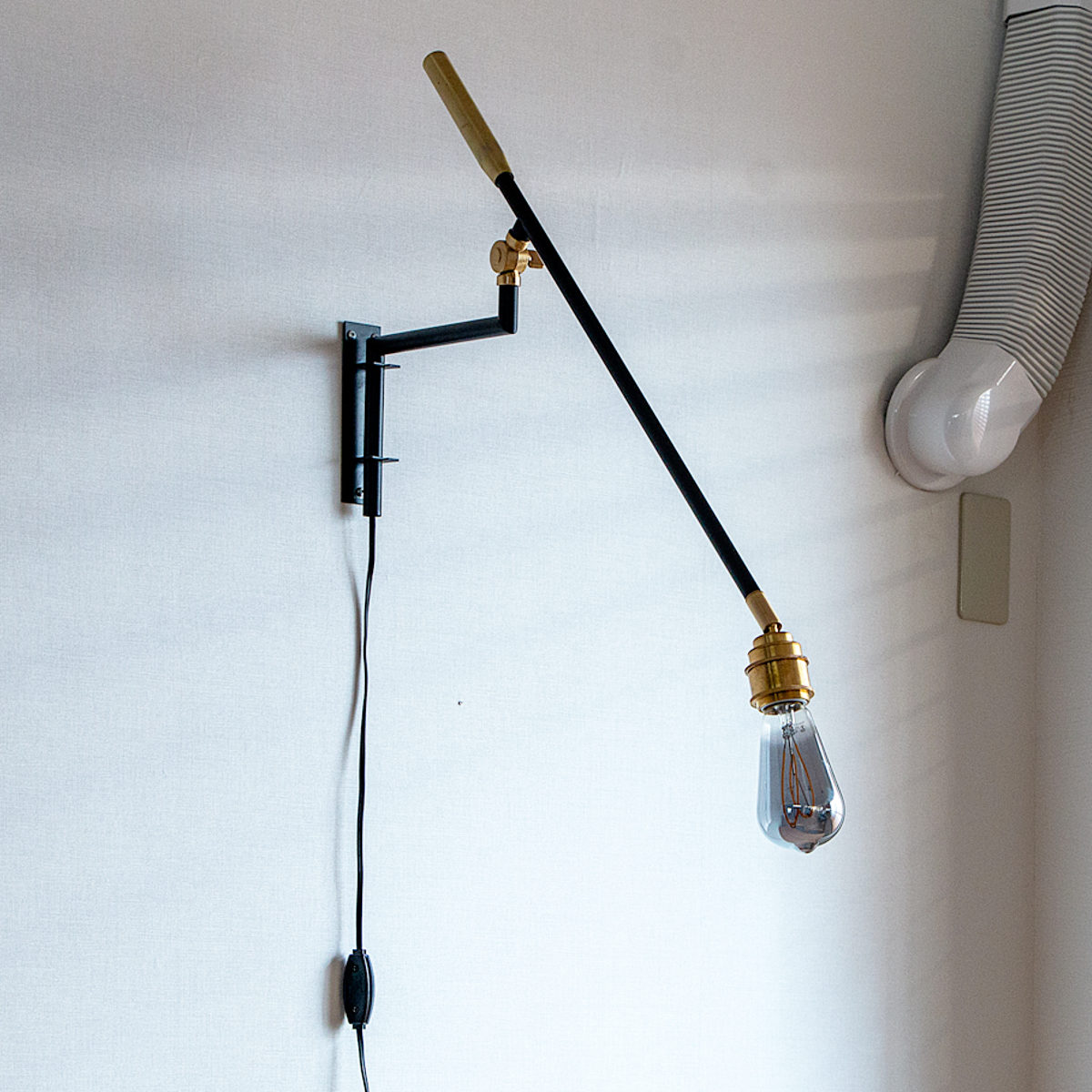 細くのびるアームがユニークなウォールライトです。マットなブラックアームに真鍮製のソケットカバーを組み合わせ、無骨でクールながら上品さを感じるデザインに仕上げました。モノトーンでまとめたお部屋やヴィンテージな雰囲気と相性が良く、おしゃれなカフェのような空間づくりにもぴったりです。