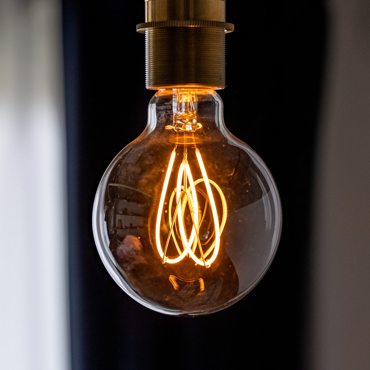 ガラスにブラックメッキを施したデザインのLED電球「CURVE」が付属しています。中のフィラメントを直視しても眩しくない程度の明るさなので、バーやレストランなどにおすすめ。色温度は低く2200ケルビンで、ろうそくの火に近い色味です。