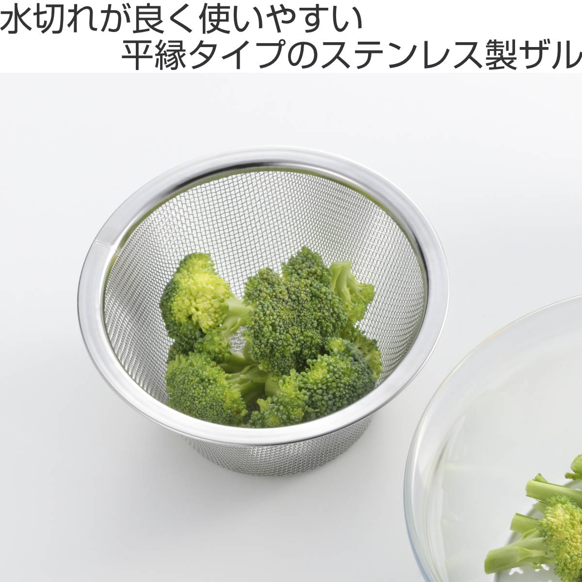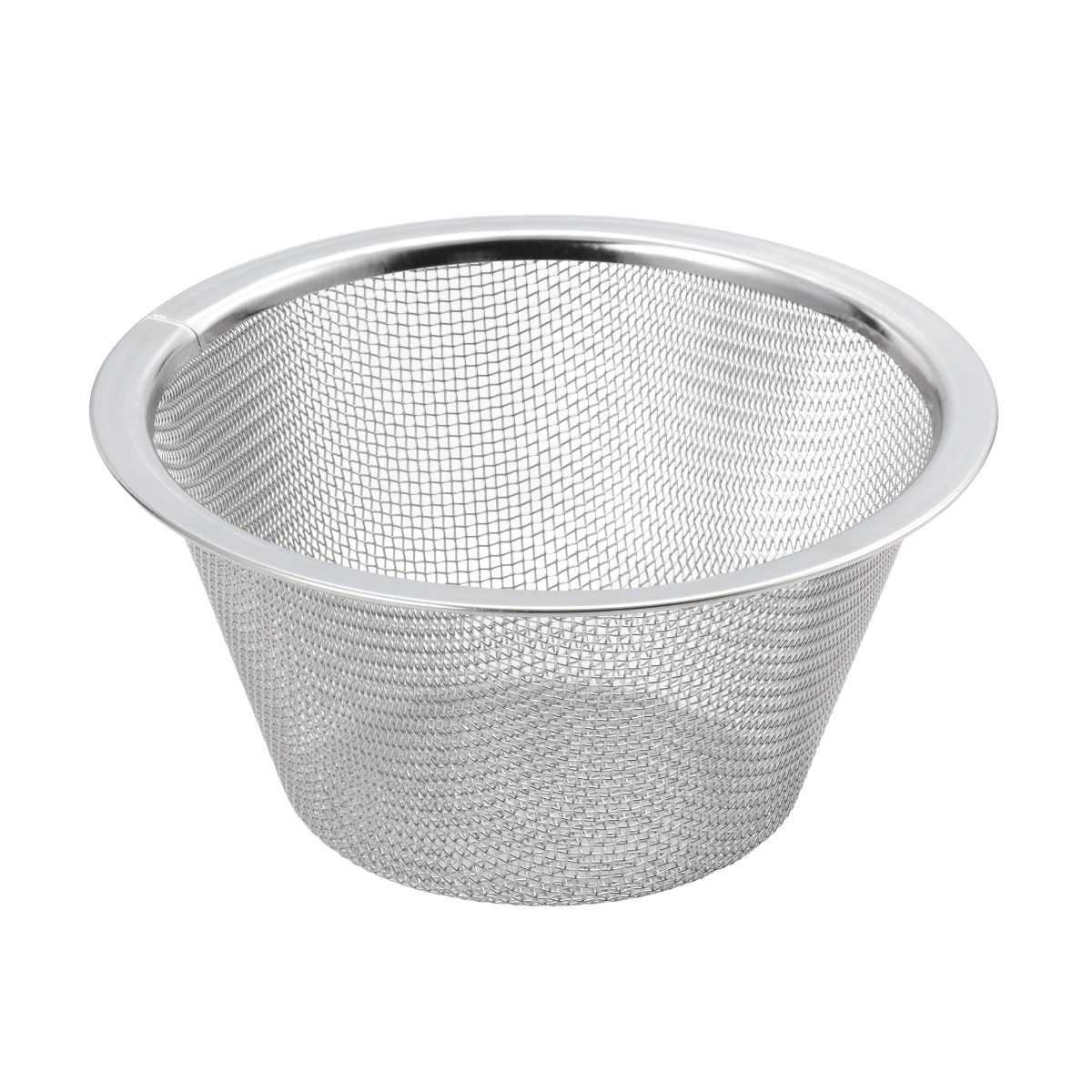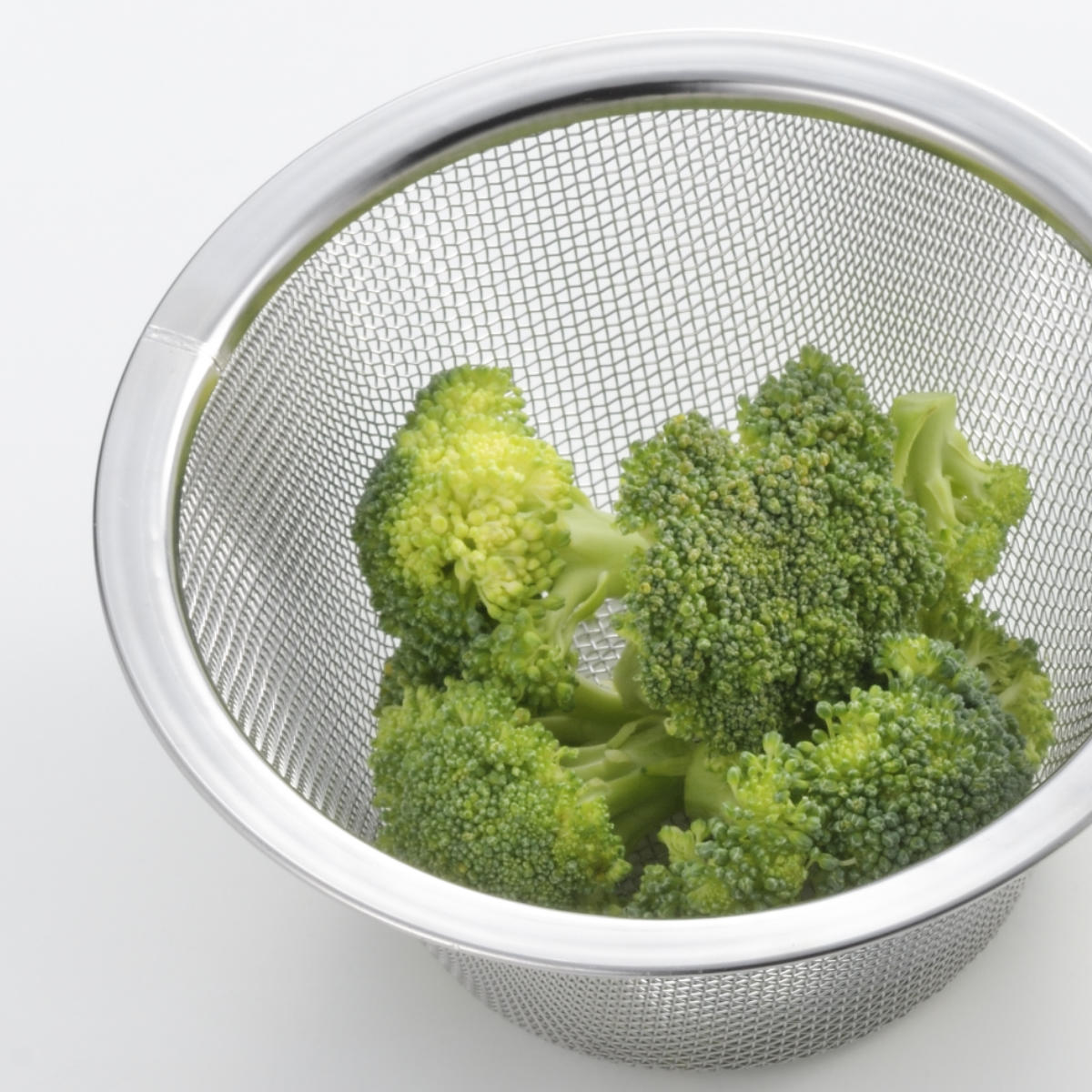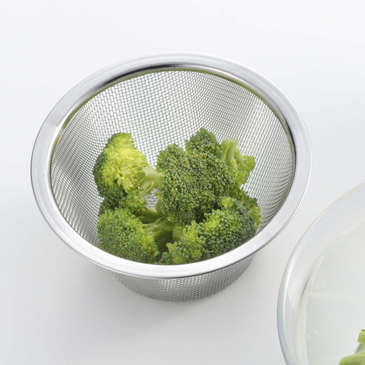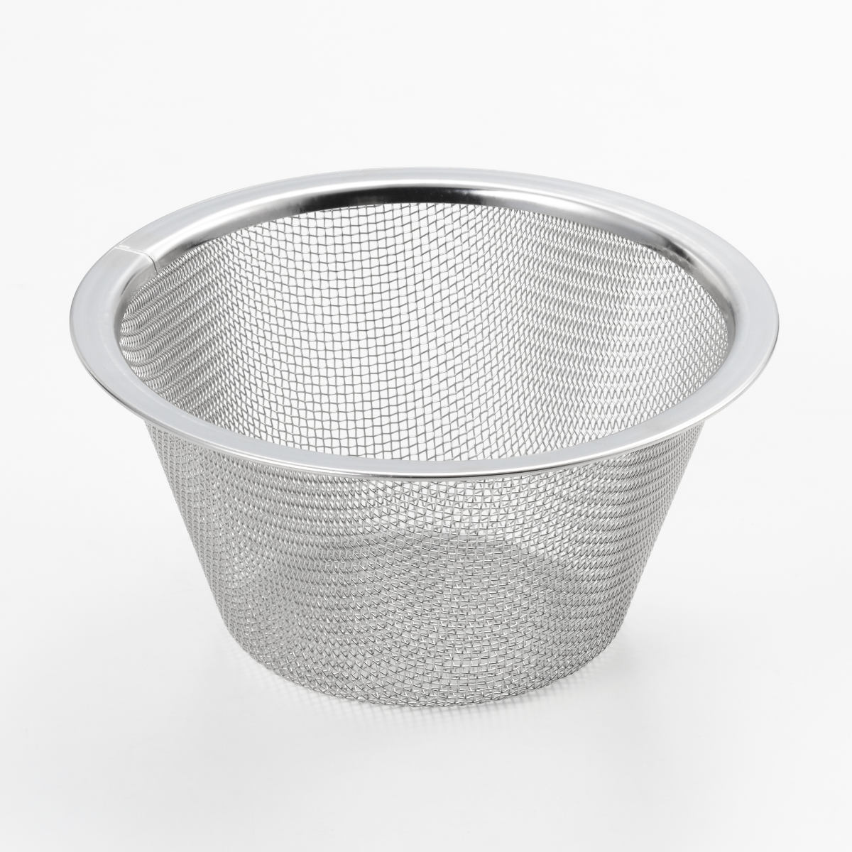 suiroの【ボウル(小)】に重ねて使用できる、平縁タイプのステンレス製ザルです。縁がフラットで安定感があり、固くしっかりとした網を使用しているため変形しにくいです。