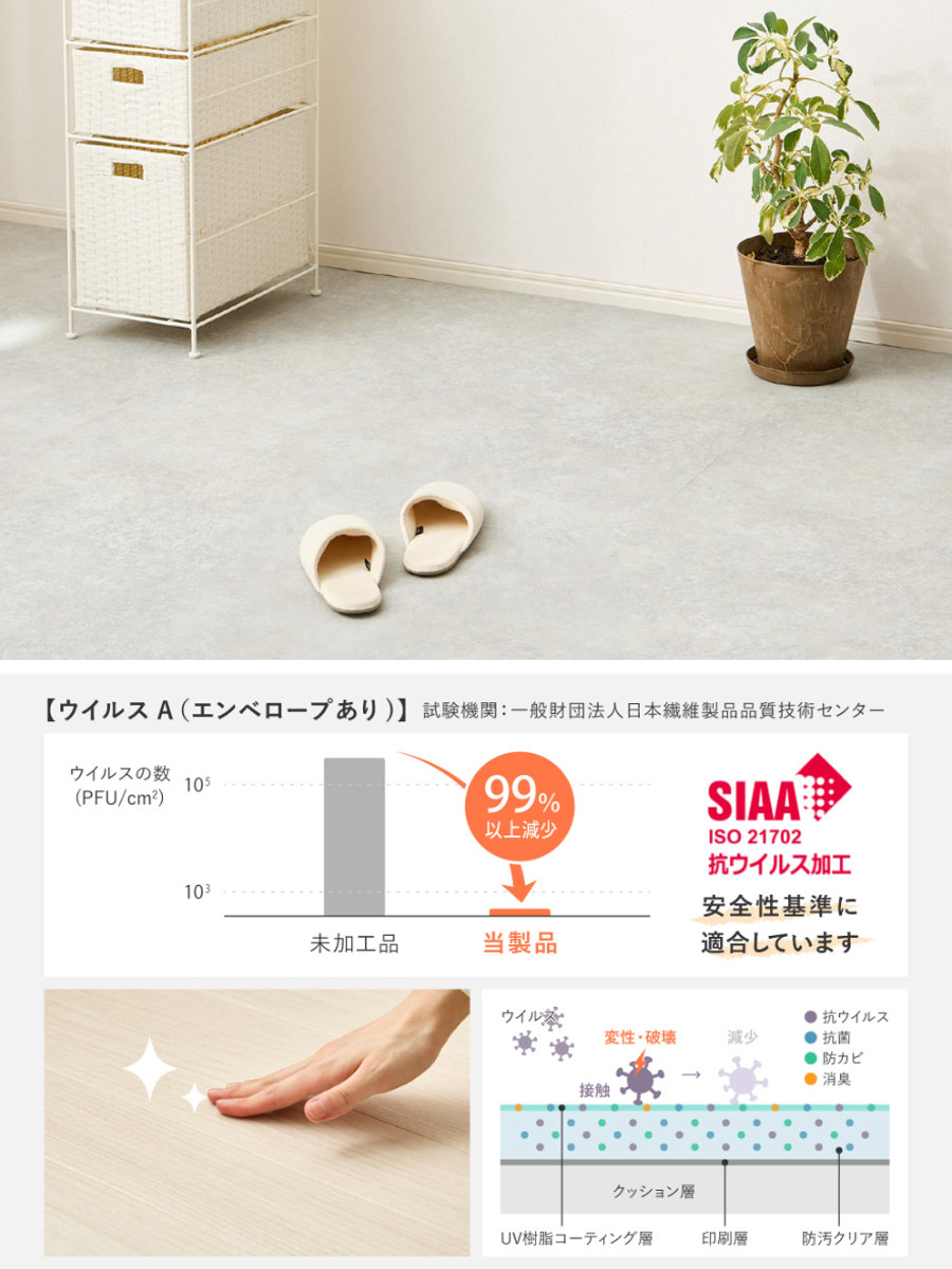 抗菌・抗ウイルス機能付きです。製品上の特定のウイルス数を99%以上減少。菌の増殖を抑制する抗菌加工で、衛生的にお使いいただけます。