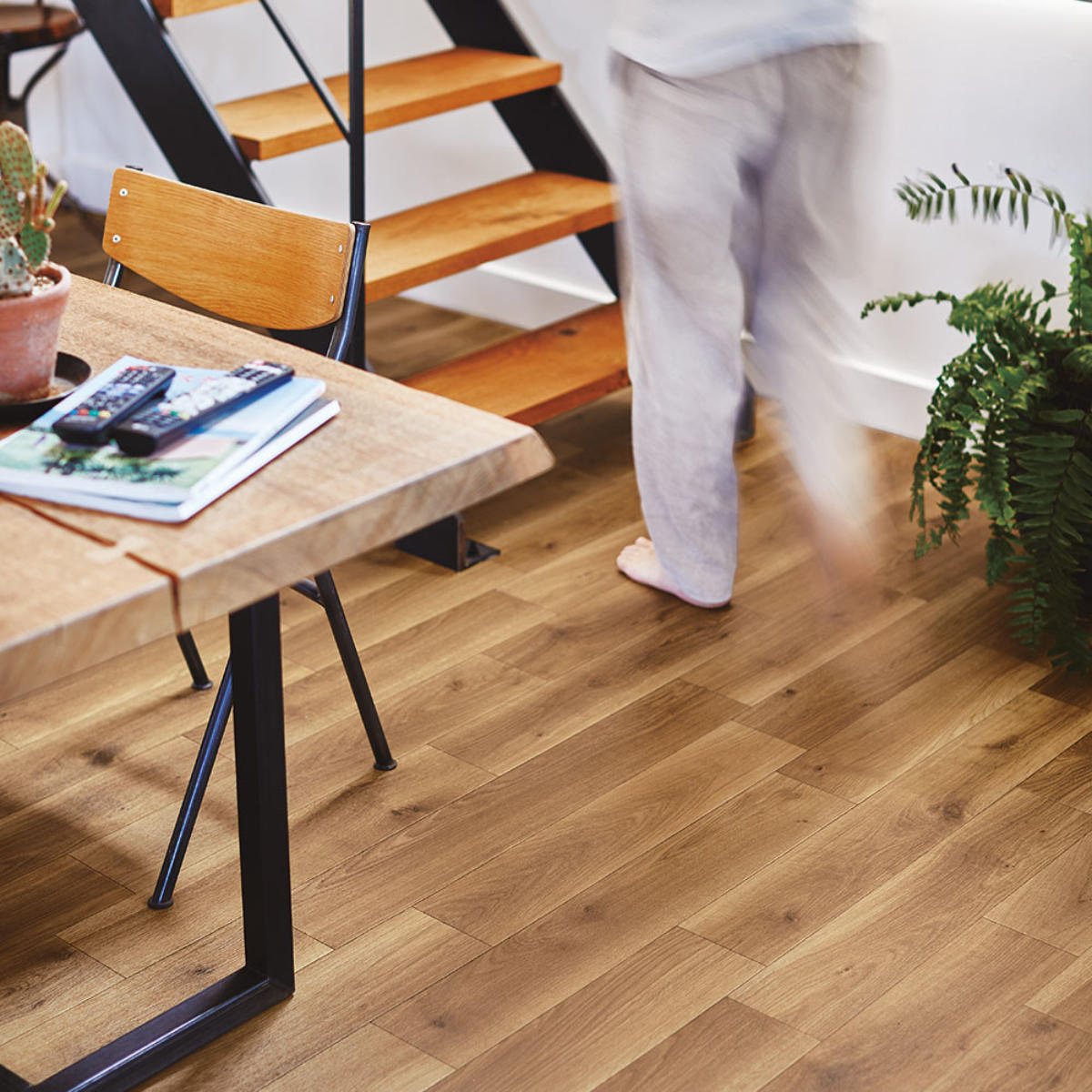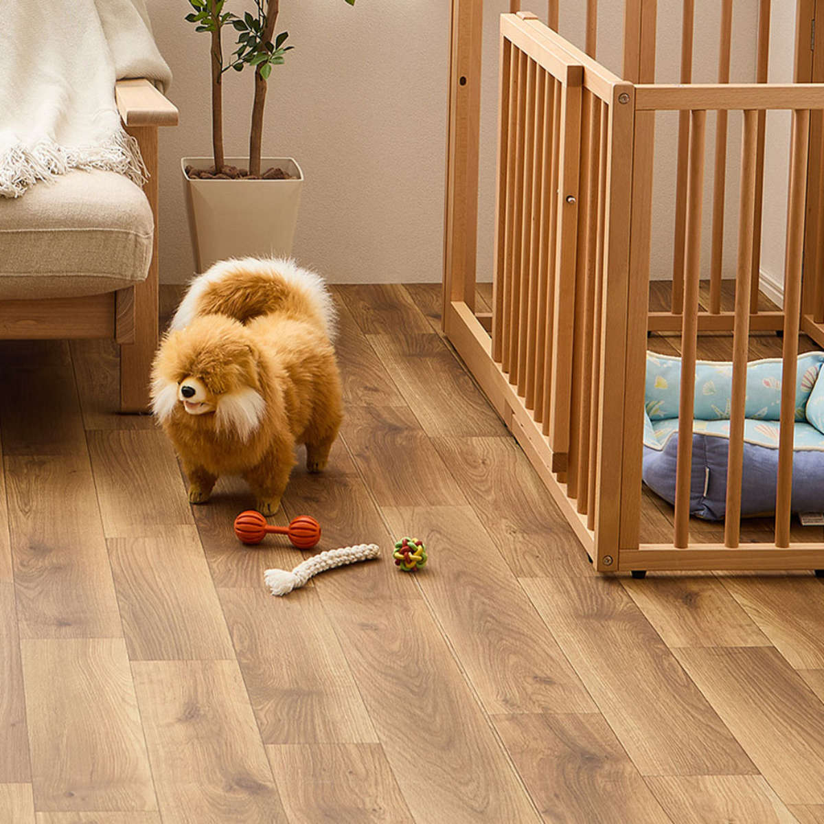 高耐久UV樹脂コーティングにより、汚れが取れやすく、ワックスいらずでお手入れが簡単です。ペットの食べこぼしやトイレの失敗で汚れてもサッと拭き取るだけで、日々のお掃除がしやすいのもうれしいポイントです。