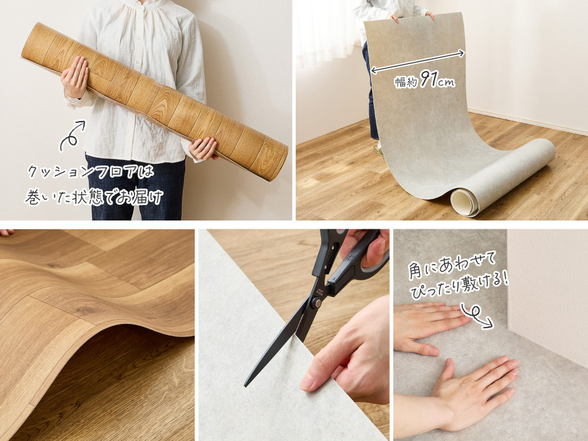 1枚の幅が約91cmずつにカットされているので扱いやすく、つなぎ合わせて敷き詰めるだけなので設置も簡単です。