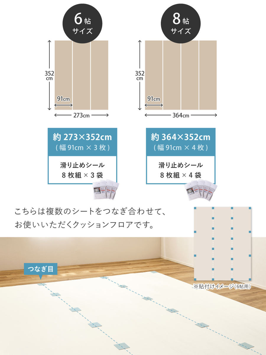 クッションフロアの固定に吸着タイプの滑り止めシール(8枚組×4袋)が付属しています。接着剤など使わず敷けるので、賃貸でもお使いただけます。