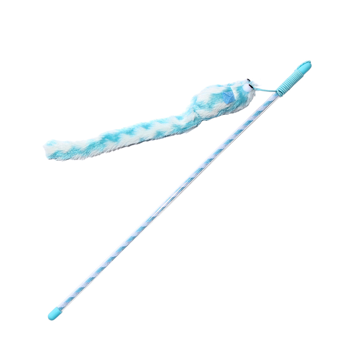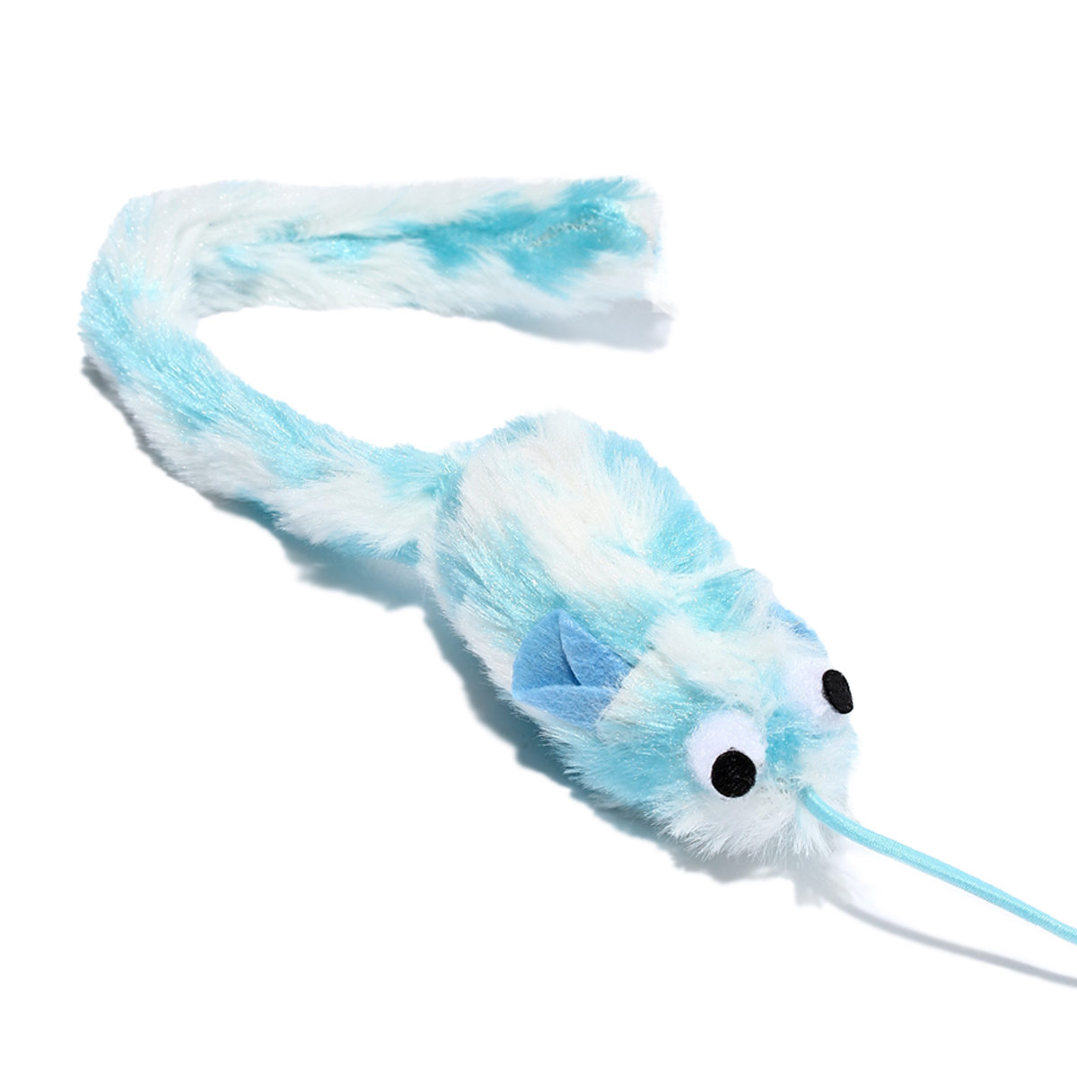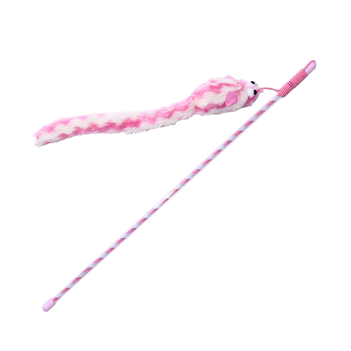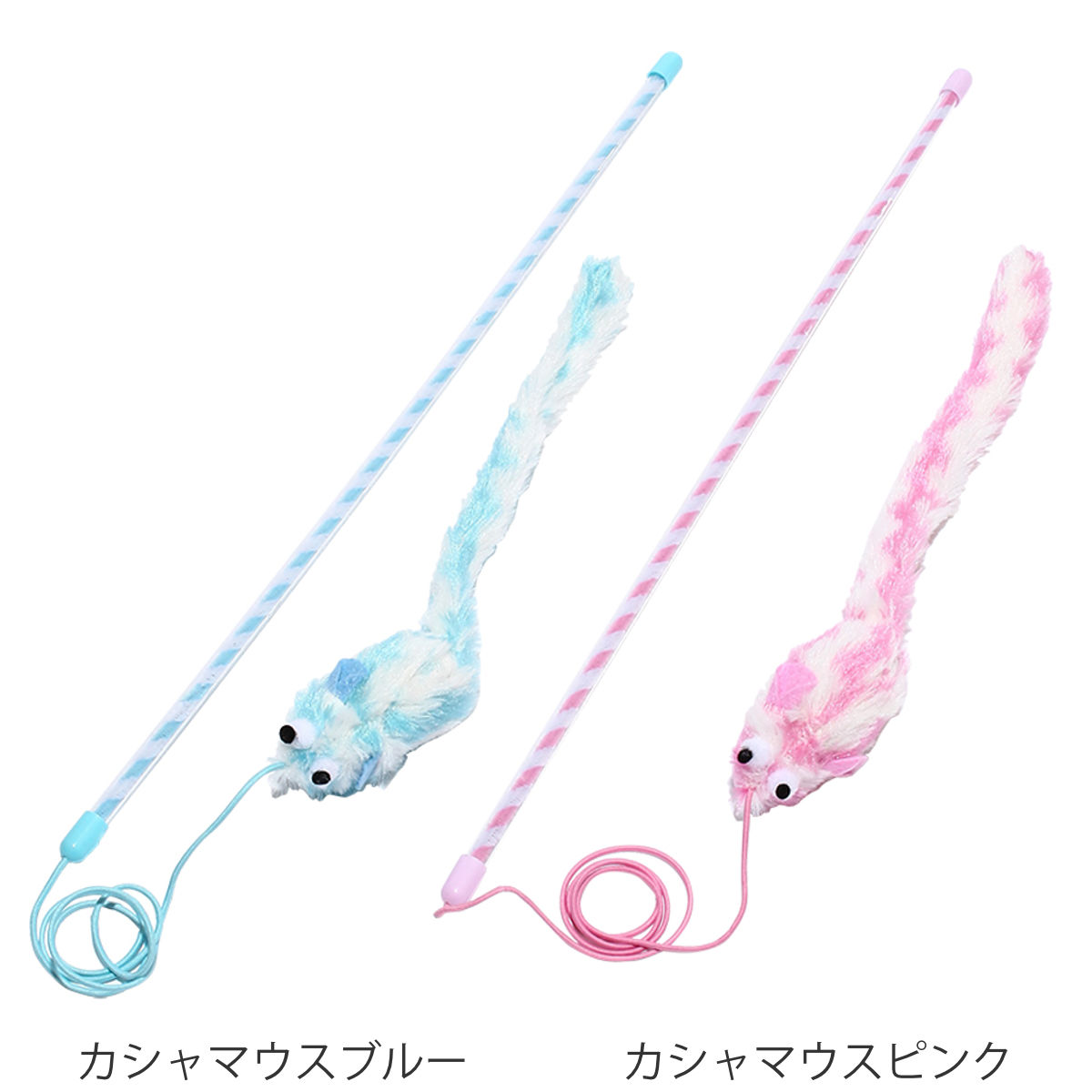 シマシマ模様のねずみ型おもちゃがゴム紐でつながった、動きが楽しい猫じゃらしです。透明ロッドの中にはシマシマモール入りで、見た目も遊び心たっぷり。しっぽはカシャカシャ音が鳴る素材を使用し、動きと音のダブル効果で猫ちゃんの狩猟本能をくすぐります。