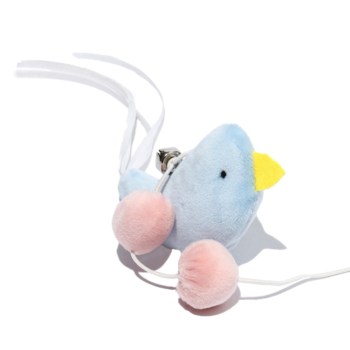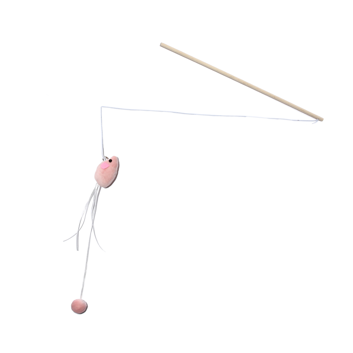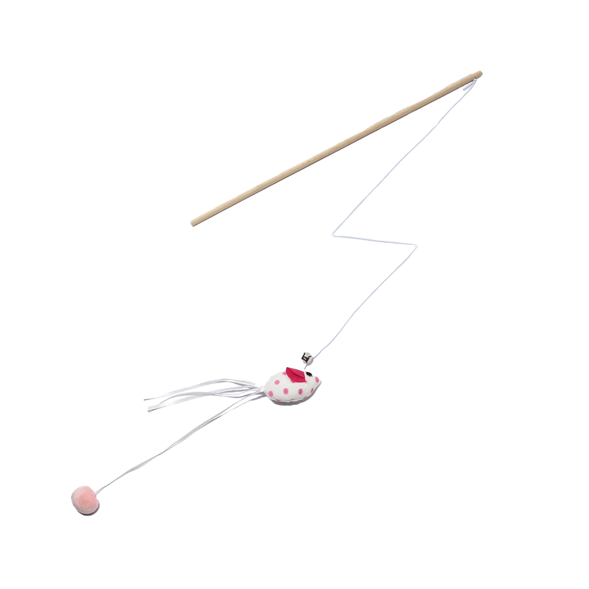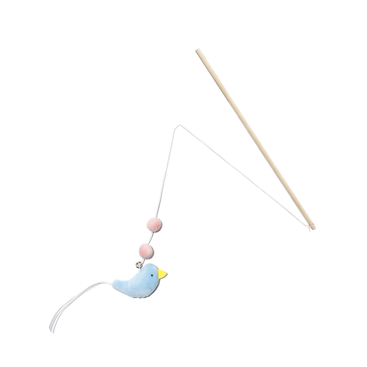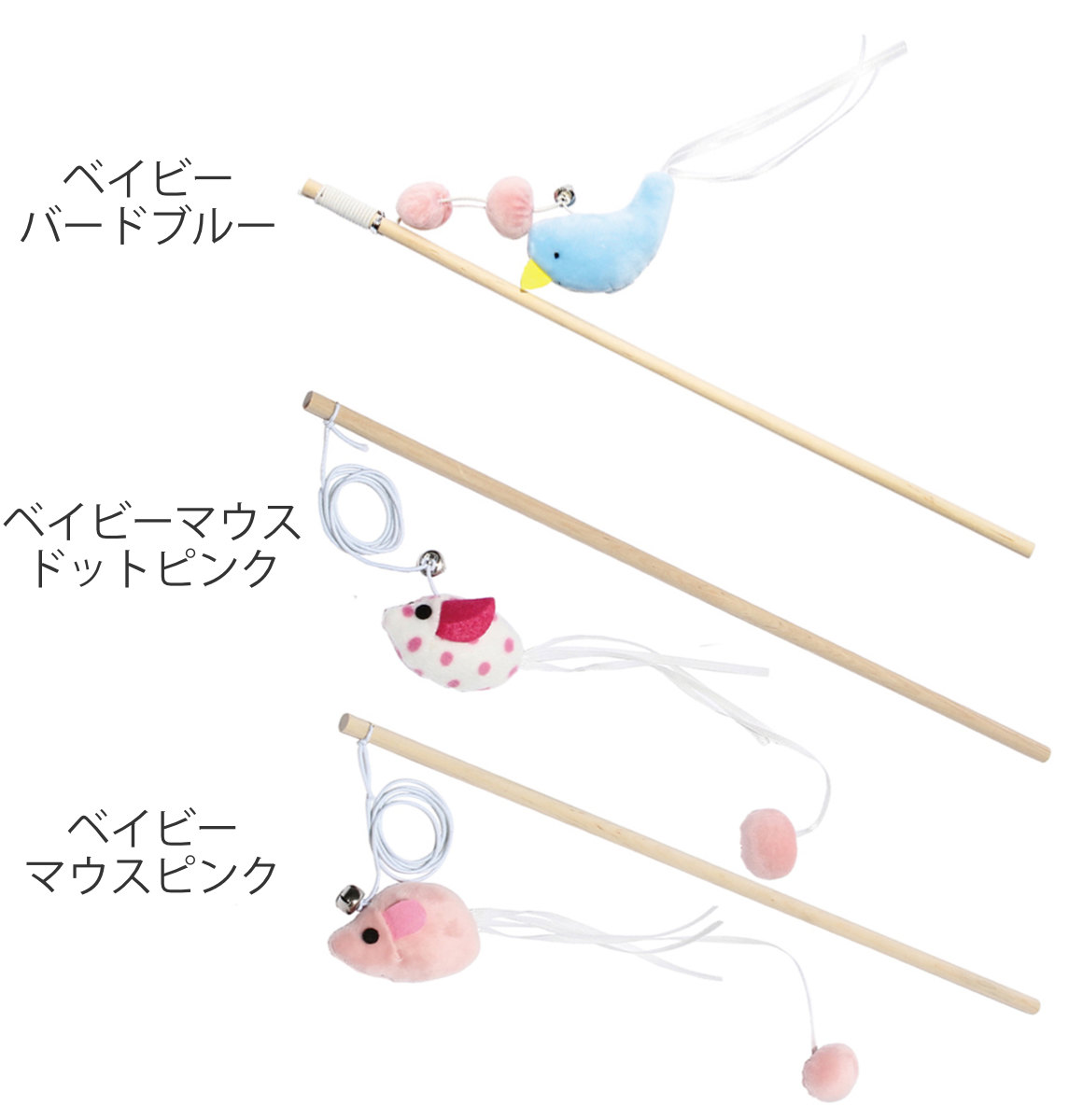 ねずみと鳥型のおもちゃがゴム紐でつながった猫じゃらしです。木製ロッドのナチュラルな風合いが、お部屋にもなじむやさしいデザインです。顔まわりの鈴と、細いリボンのしっぽが動きと音で猫ちゃんの好奇心をくすぐります。