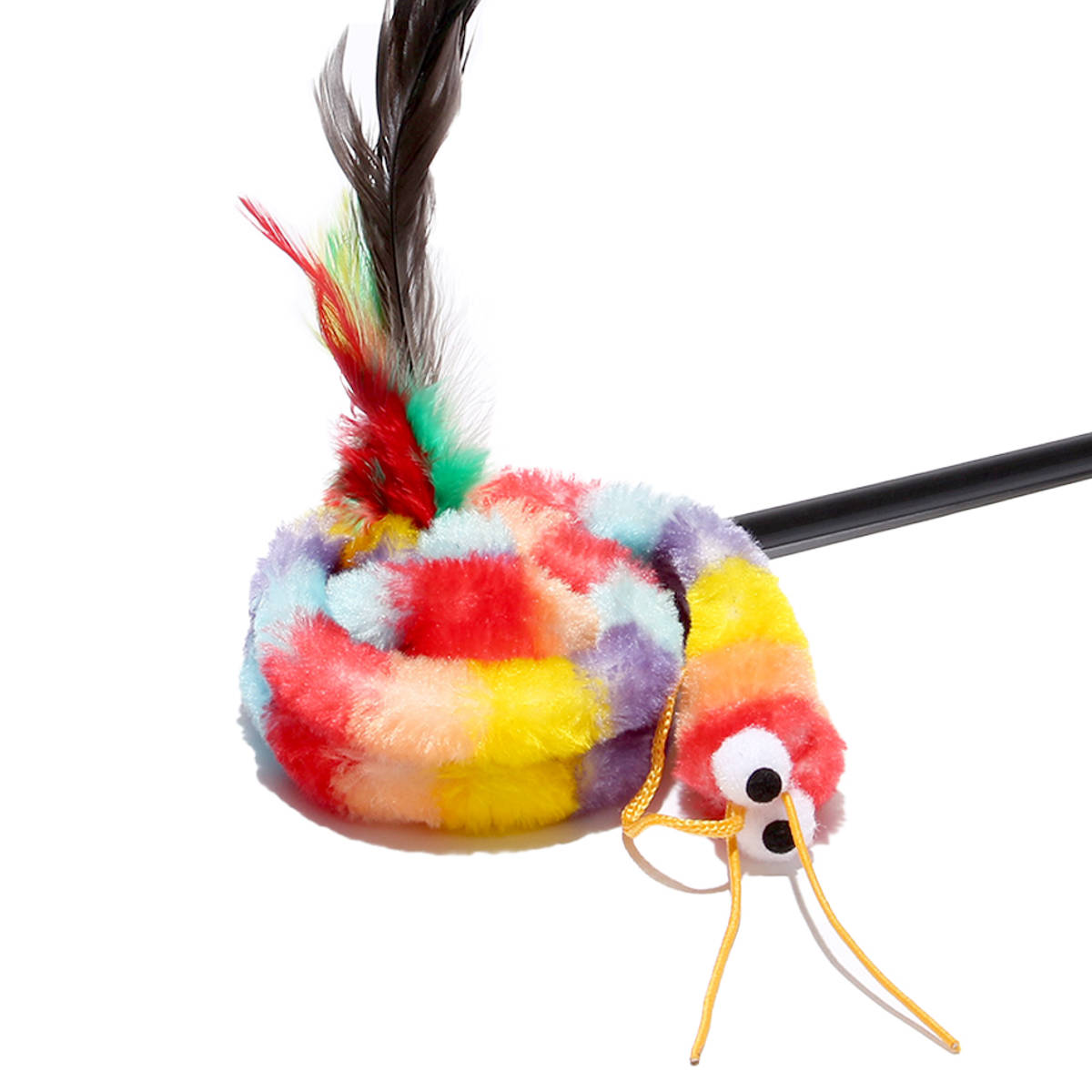 レインボーのシマシマ柄が目を引く、長い虫型おもちゃの猫じゃらしです。ブラックの筒状ロッドで振りやすく、しなやかな動きを演出します。頭には細いゴム紐の触角、しっぽにはふわりと揺れる羽根付き。視覚と動きで猫ちゃんを夢中にさせます。