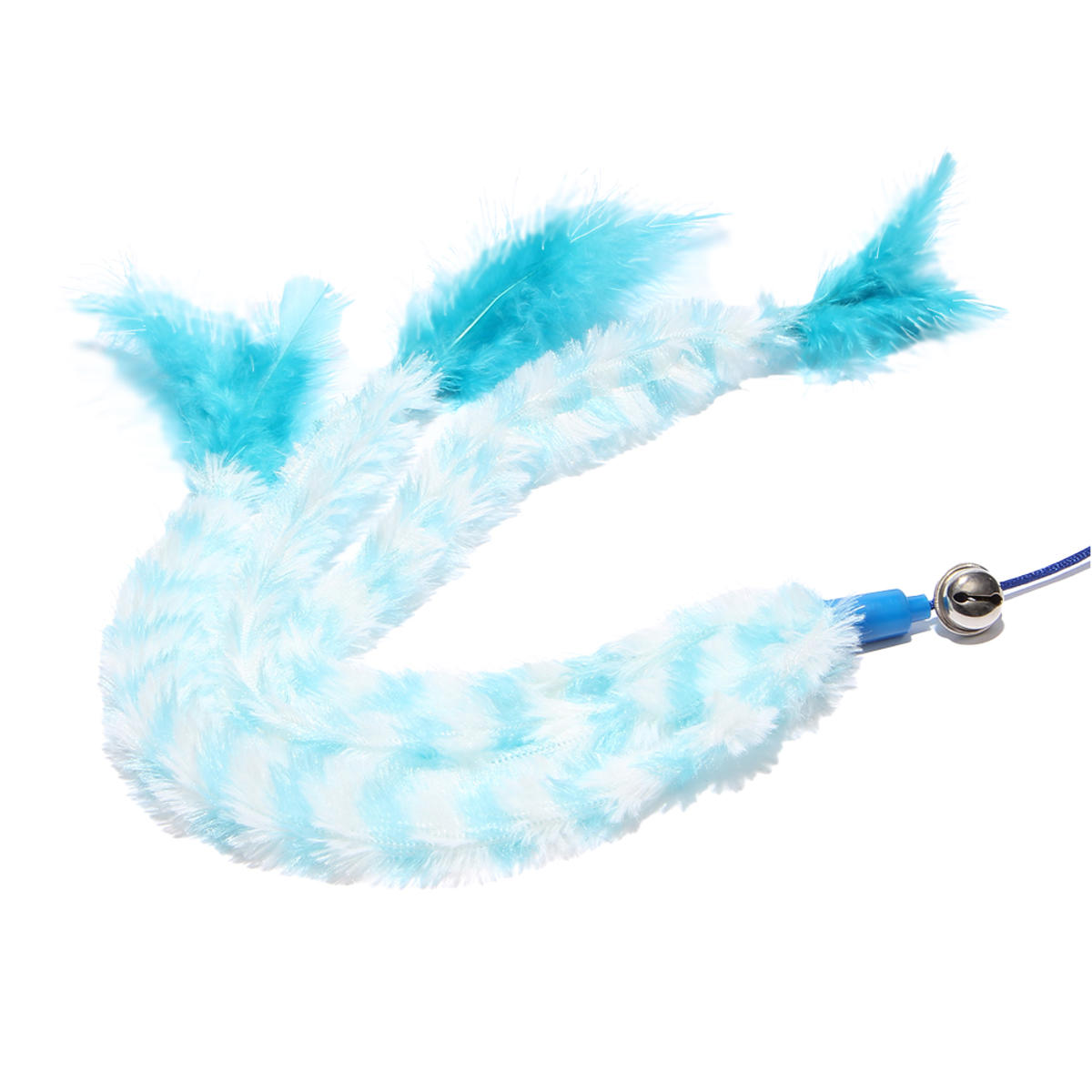 縞模様のフワフワ生地でできた細長い帯に羽根をあしらい、3本まとめてゴム紐でつないだ猫じゃらしです。透明ロッドの中にはシマシマモール入りで、見た目も楽しいデザインです。鈴の音と軽やかな動きが合わさって、猫ちゃんの好奇心をしっかりキャッチします。