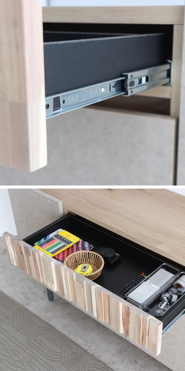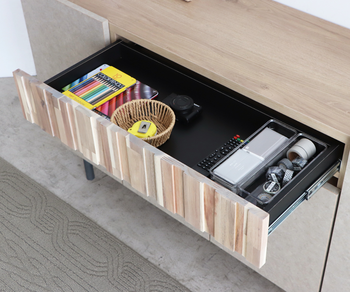 引き出しにはフルスライドレールを採用。軽い力でスーッと開閉でき、毎日の出し入れもストレスなく行えます。奥までしっかり引き出せるので、収納物も見やすく取り出しやすい設計です。