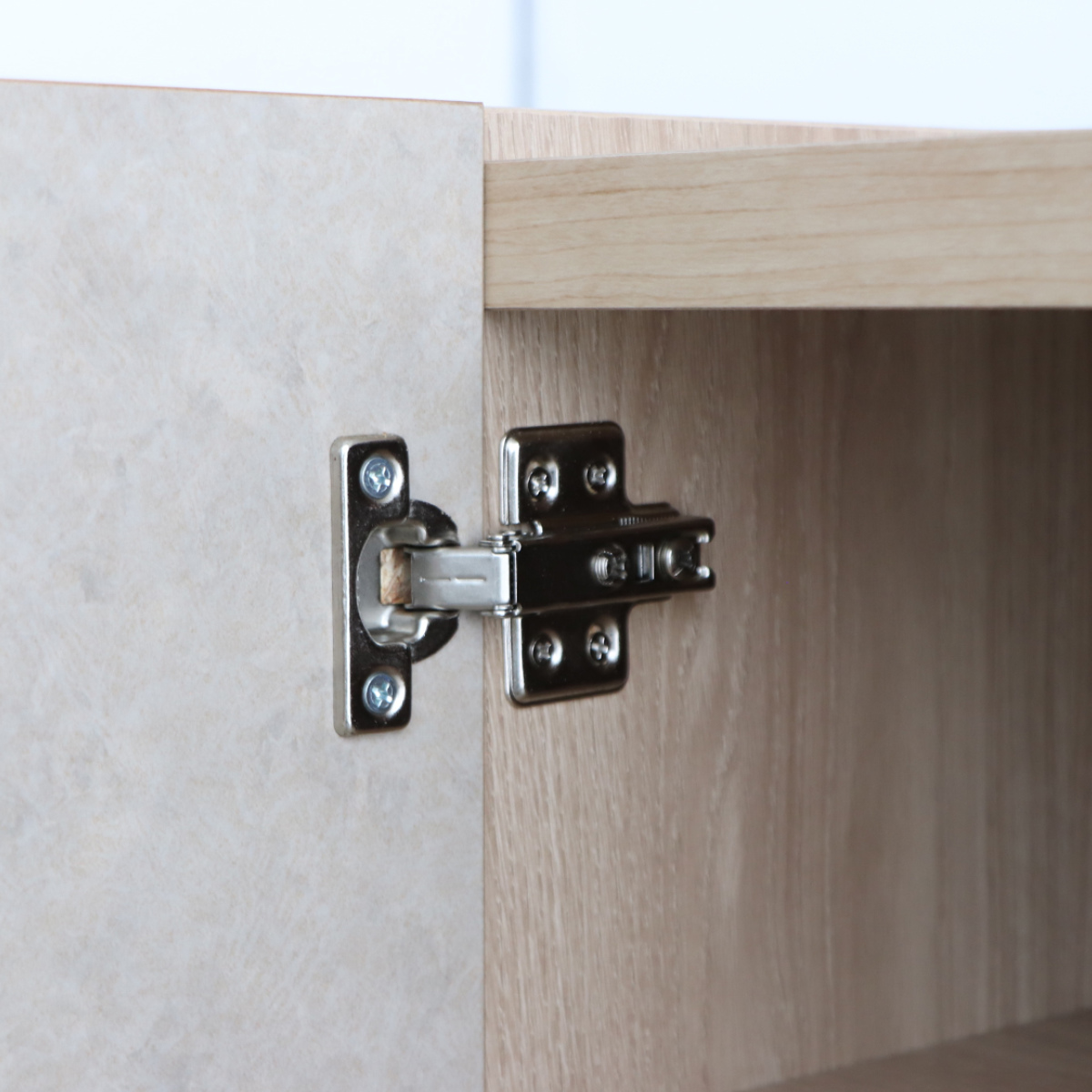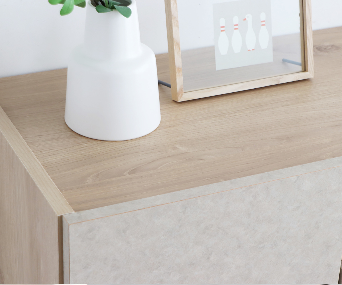 ベージュの石目調と、ナチュラル木目がやさしく調和します。置くだけでお部屋になじみ、整った印象に仕上がります。扉付き収納で配線や小物を隠せるため、生活感を抑えてきれいな空間を保てます。見た目と使いやすさを両立した一台です。