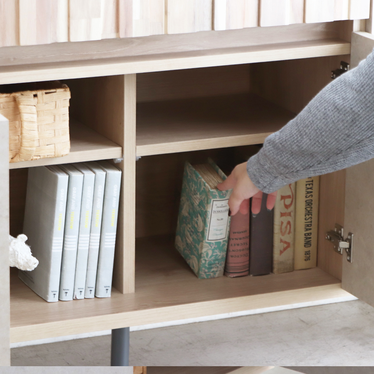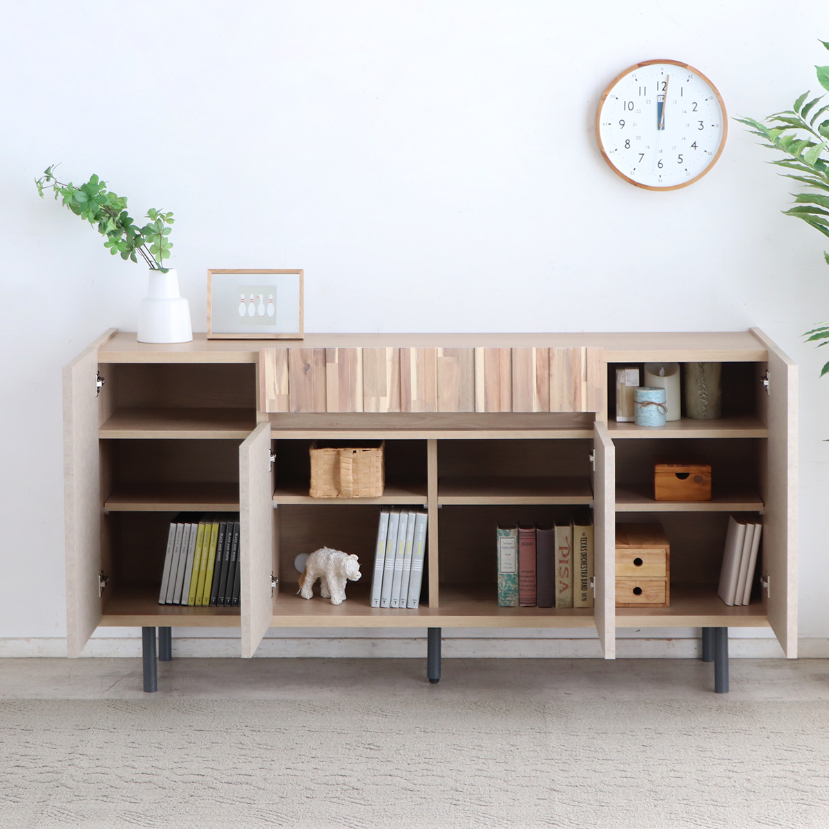 扉を開けると、固定棚に加えて可動式の棚を4枚備えています。収納する物に合わせて棚の高さを自由に調整できるため、本や雑誌、リモコン、小物類などを整理整頓できます。