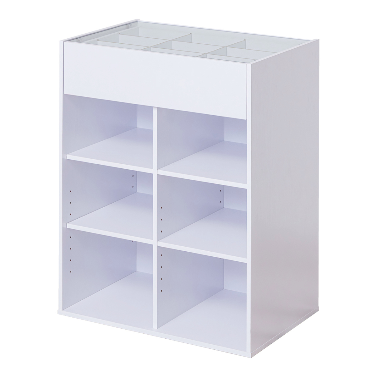 上段は固定棚、可動棚は真ん中の2枚で、3cmピッチ8段階に調節できます。収納物に合わせたお好みのレイアウトが楽しめます。