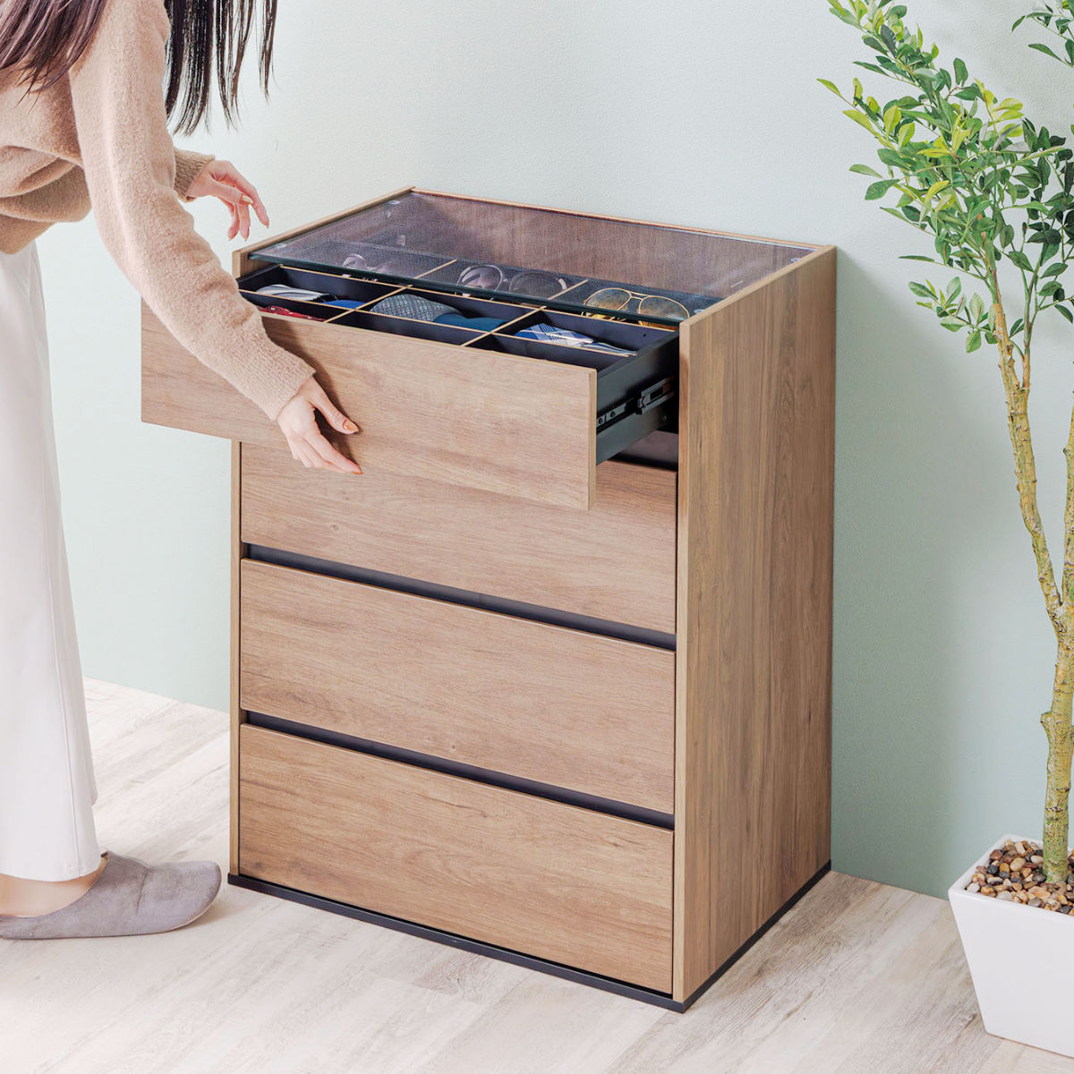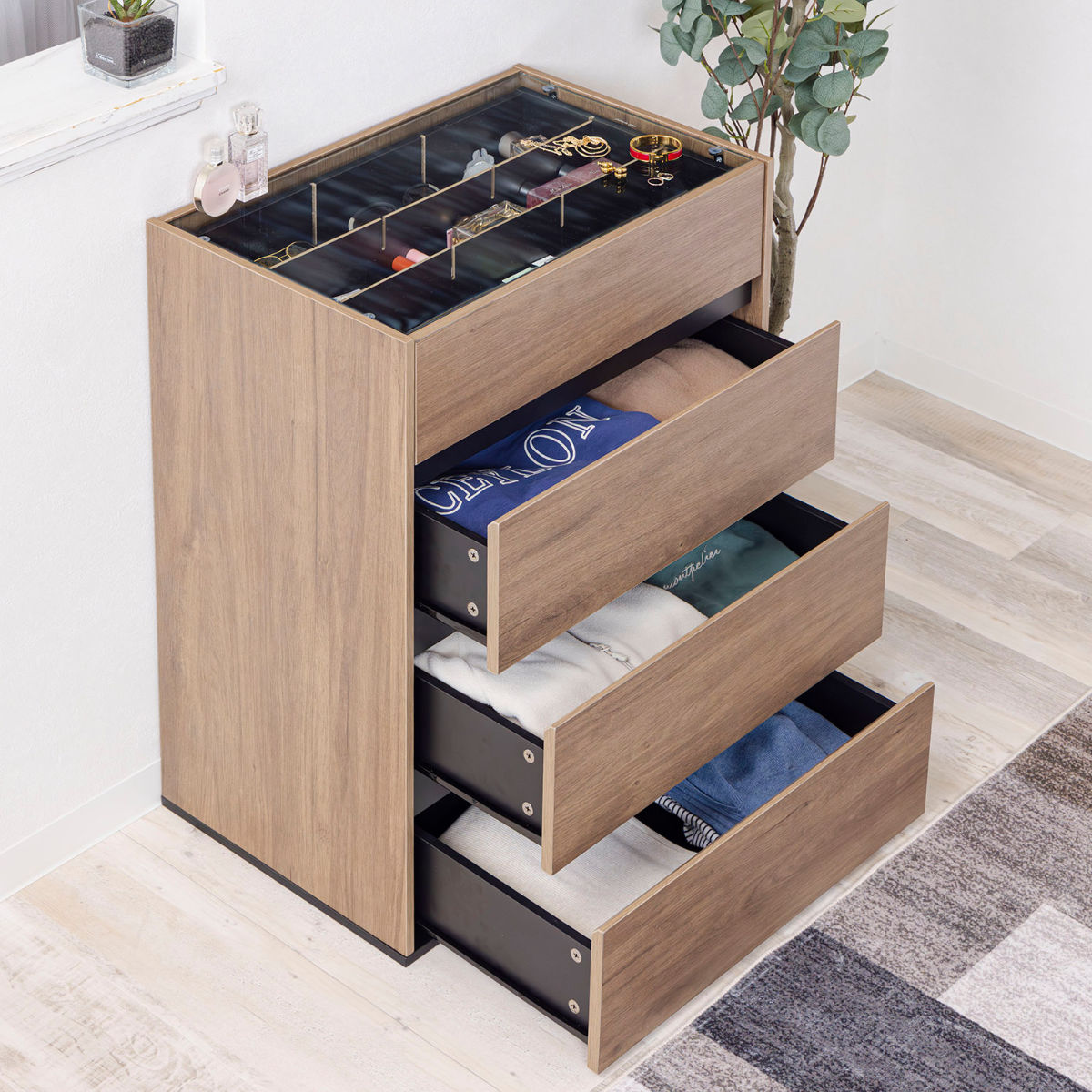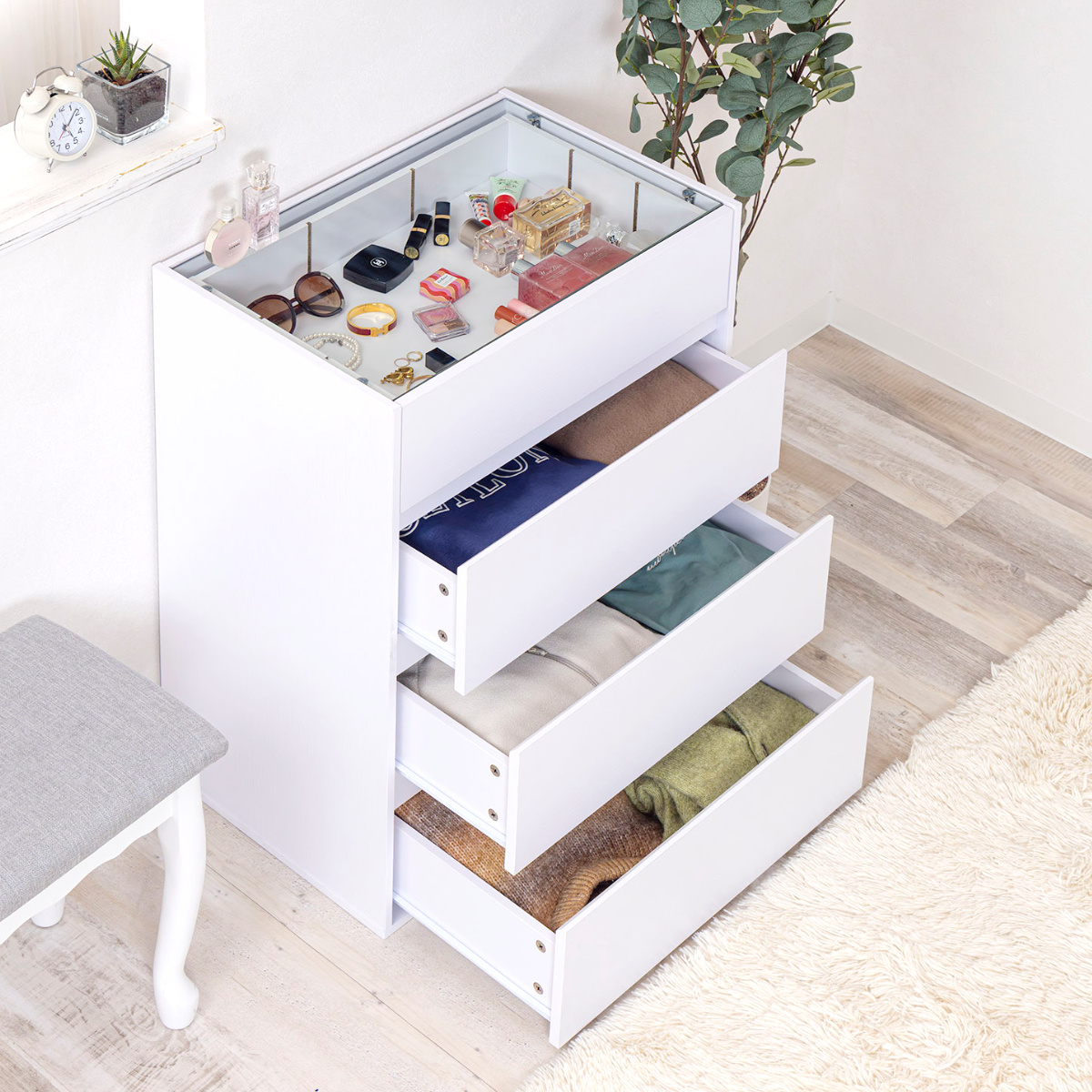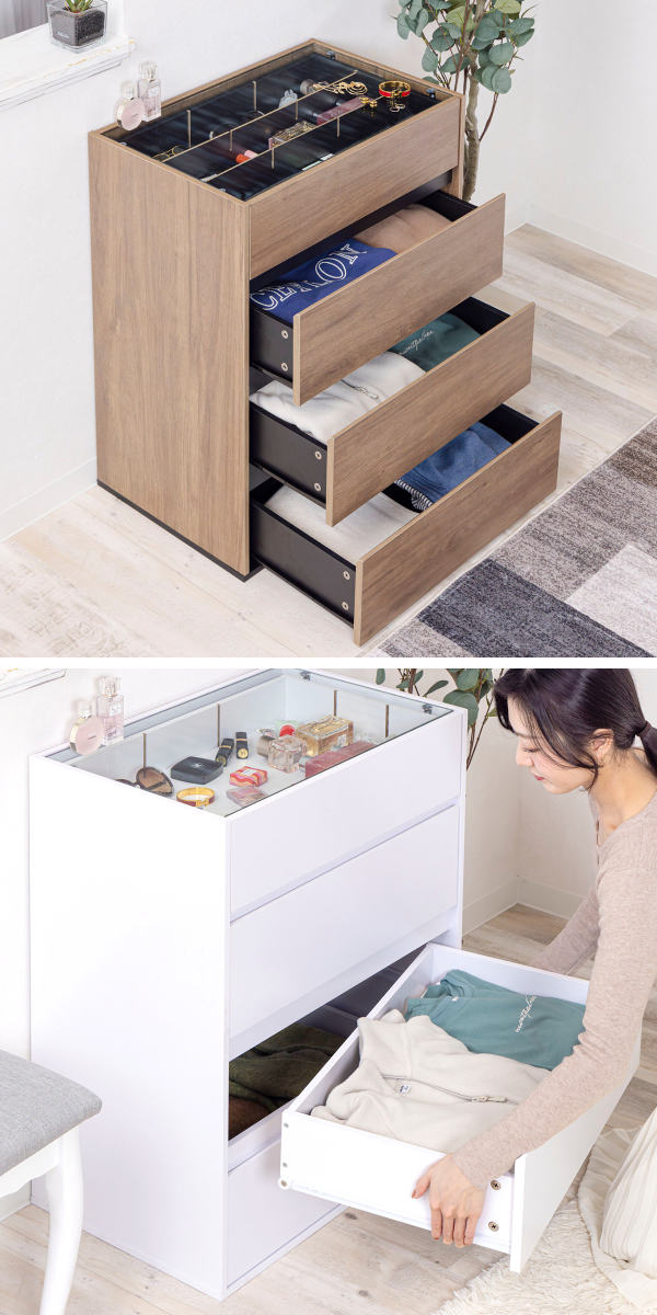 コンパクトながら、ディスプレイ収納と引き出し収納を両立したガラス天板付きチェストです。リビングや玄関、寝室、ワンルームにも置きやすいサイズで、生活感はすっきり隠せます。アクセサリーも洋服もこれ一台で美しく整います。