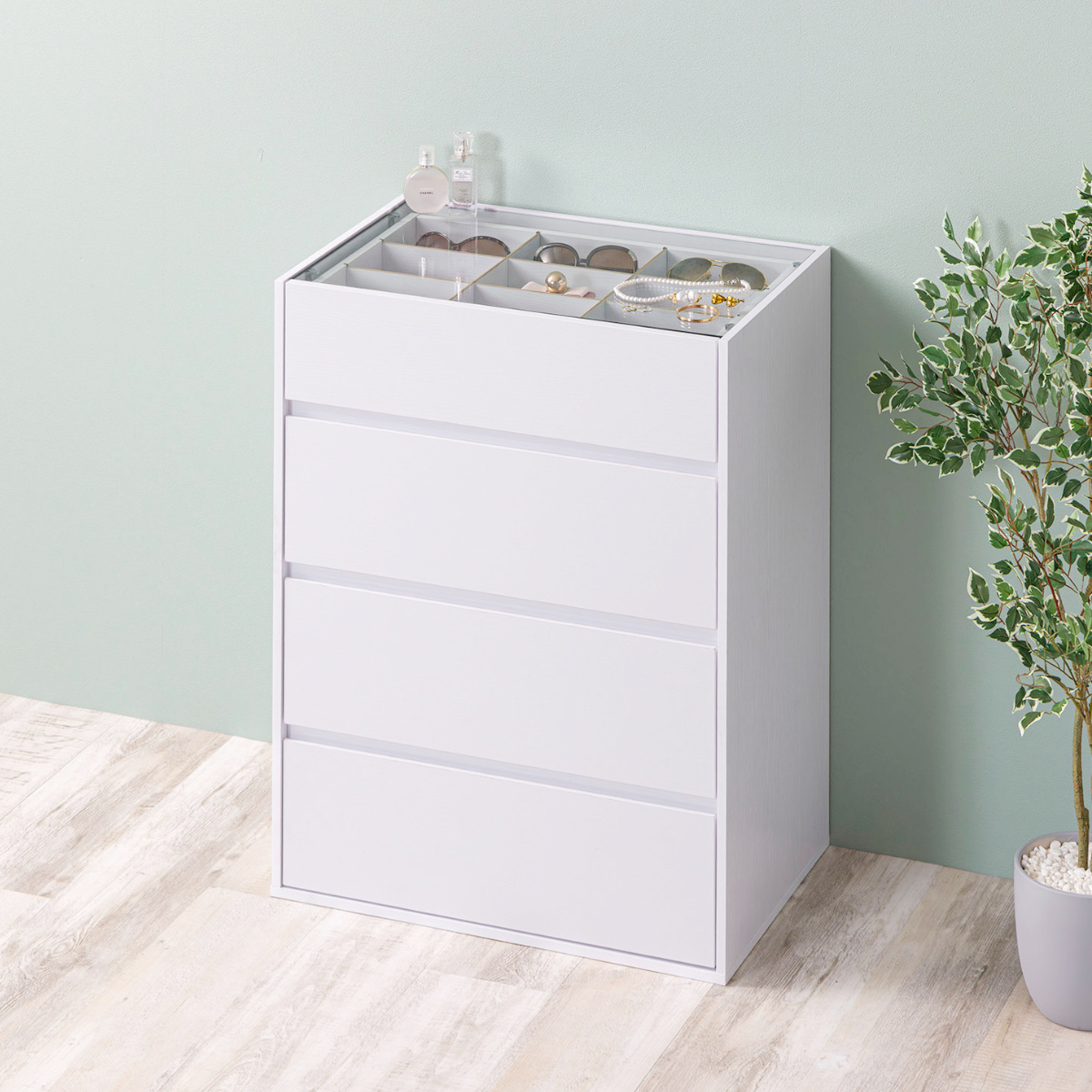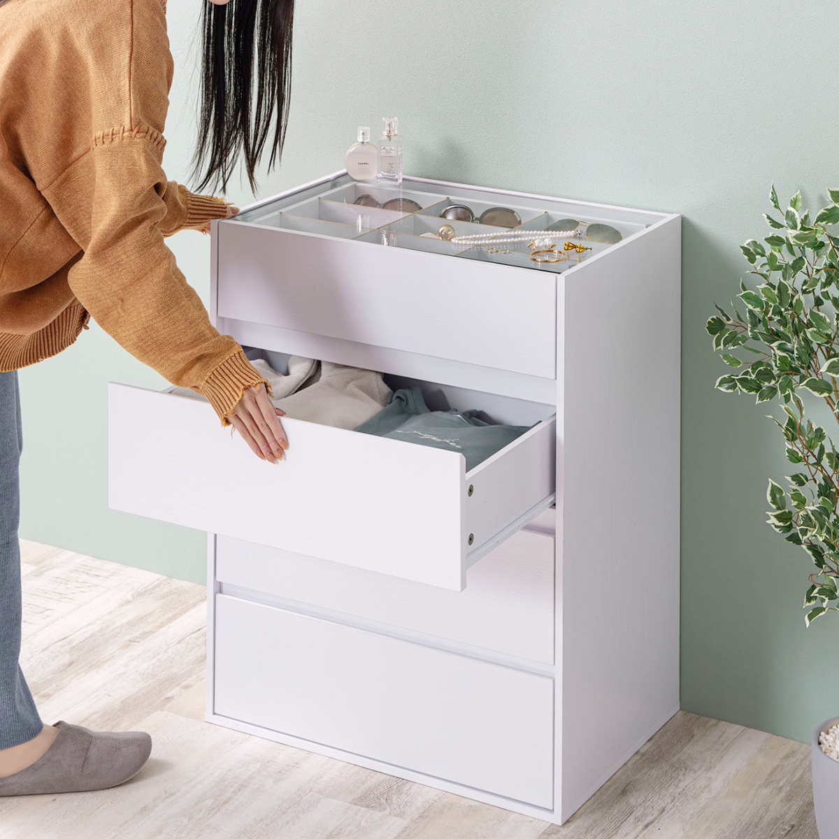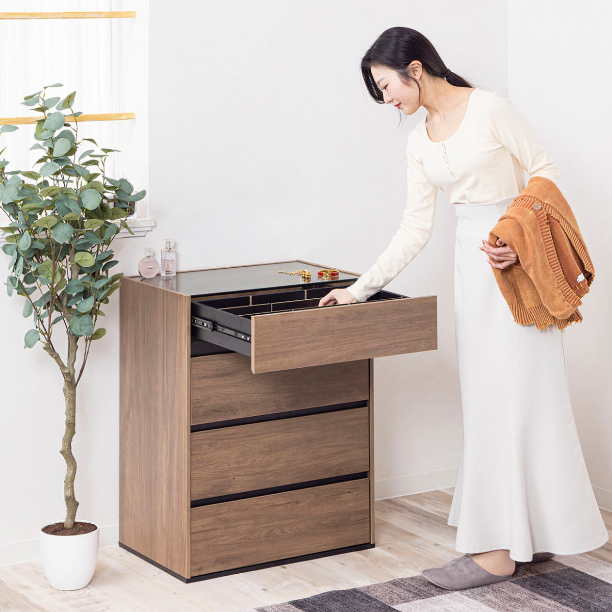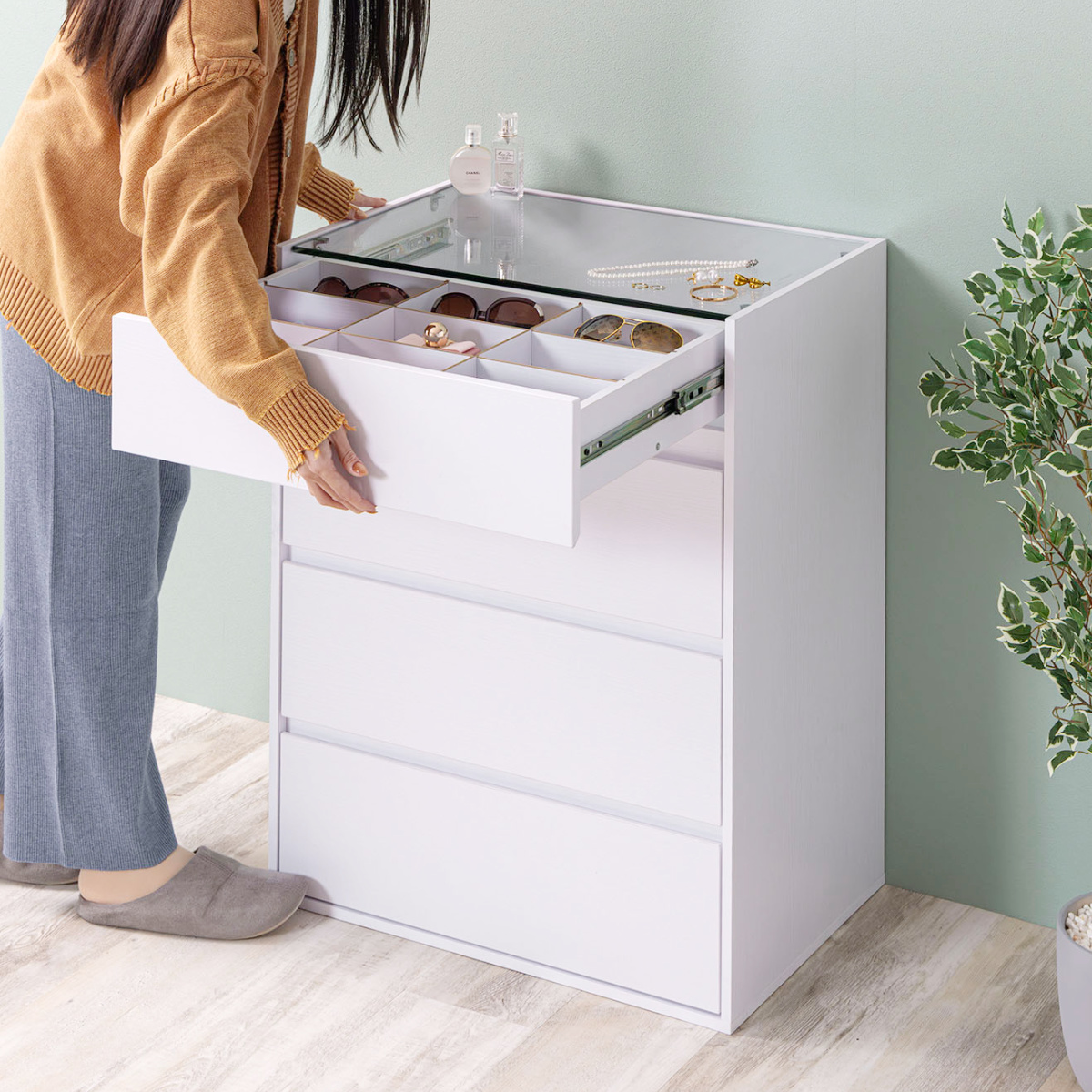コンパクトながら、ディスプレイ収納と引き出し収納を両立したガラス天板付きチェストです。リビングや玄関、寝室、ワンルームにも置きやすいサイズで、生活感はすっきり隠せます。アクセサリーも洋服もこれ一台で美しく整います。