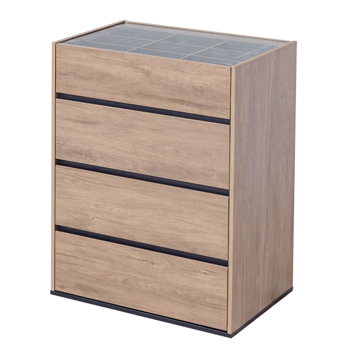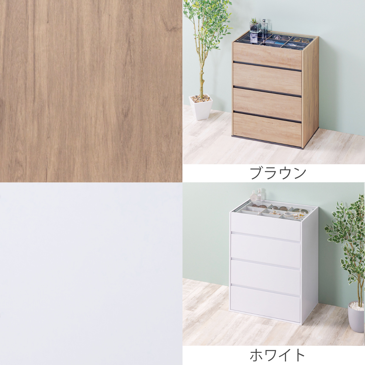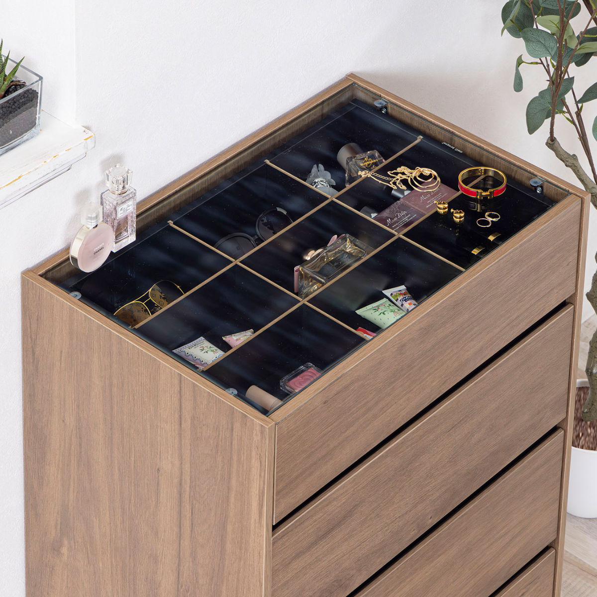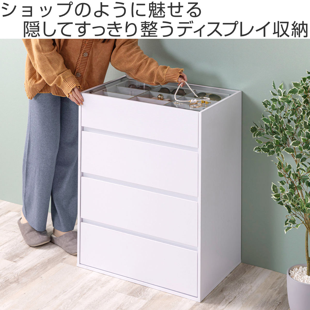 コンパクトながら、ディスプレイ収納と引き出し収納を両立したガラス天板付きチェストです。リビングや玄関、寝室、ワンルームにも置きやすいサイズで、生活感はすっきり隠せます。アクセサリーも洋服もこれ一台で美しく整います。