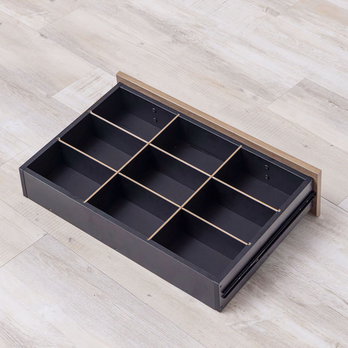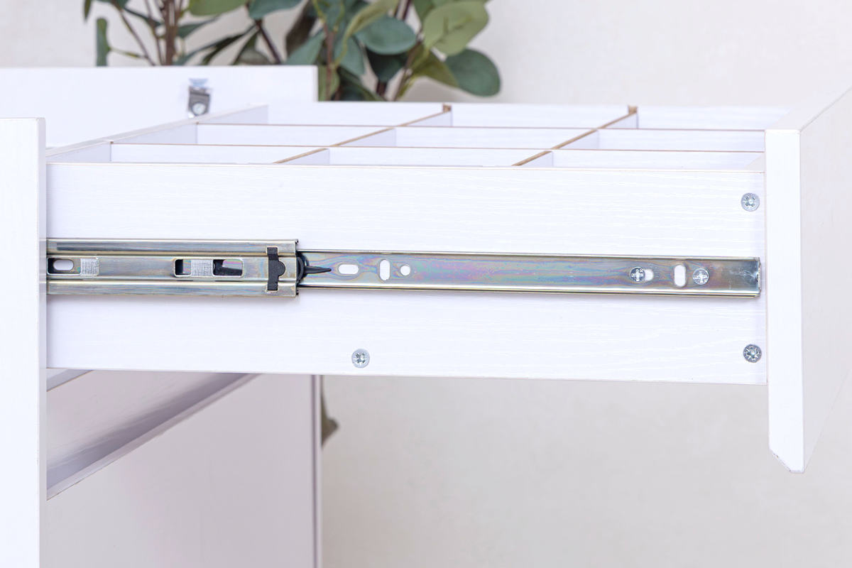 上段のガラス天板付き引出しは、なめらかなスライドレール付きで、 収納物が増えてもスムーズに開閉できます。